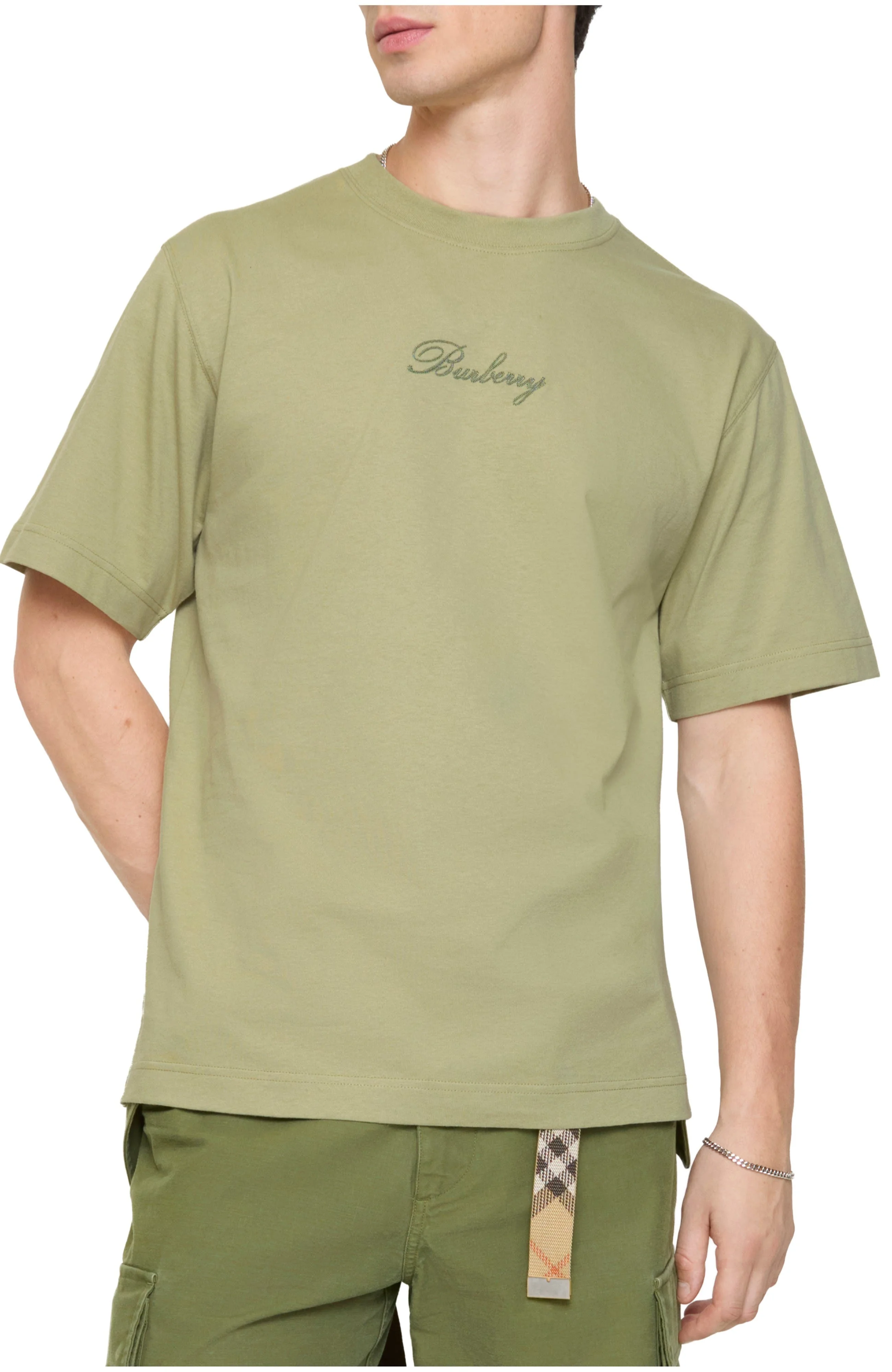 A crew-neck T-shirt cut to a relaxed fit in midweight cotton jersey. The design features a cursive logo in chain-stitch embroidery filled with the Burberry Check.||Rib-knit neckline|Embroidered Burberry lettering at chest and back Relaxed fit: a looser cut than our regular fit. Length: 74cm/29.1in (size UK L) 100% cotton Trims: 97% cotton, 3% elastane; 100% cotton Machine wash Made in Portugal