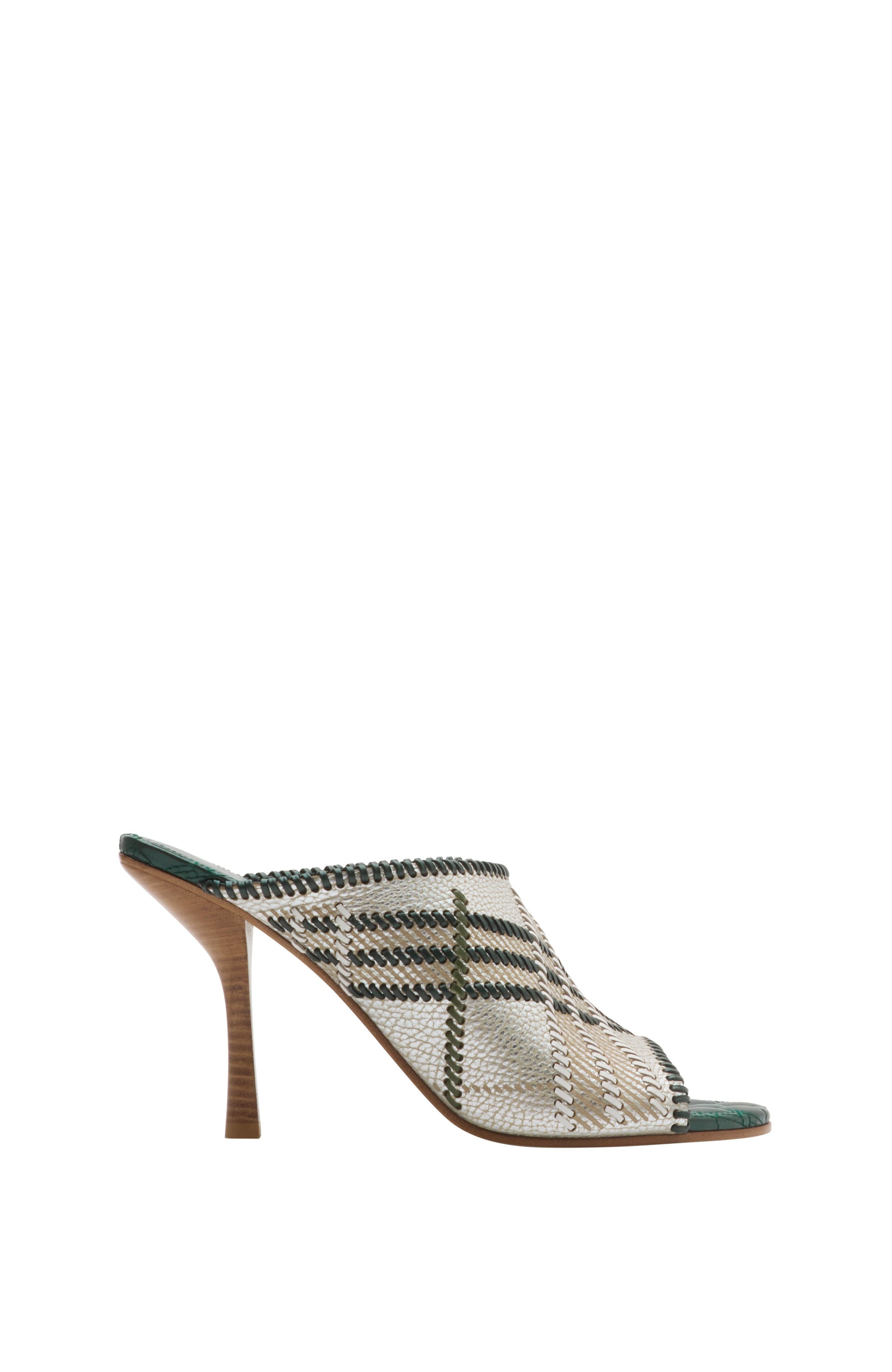 Mules made in Italy from metallic leather, hand-woven with the Burberry Check and set on a stiletto heel. The insole is quilted for comfort and the sole is embossed with our Equestrian Knight Design.||Almond-shaped toe|Quilted leather insole|Stiletto heel|Equestrian Knight Design at sole|Comes with a dust bag Heel height: 9cm/3.5in Upper: 50% calf leather, 50% sheep leather Lining: 100% sheep leather Sole: 100% leather Made in Italy