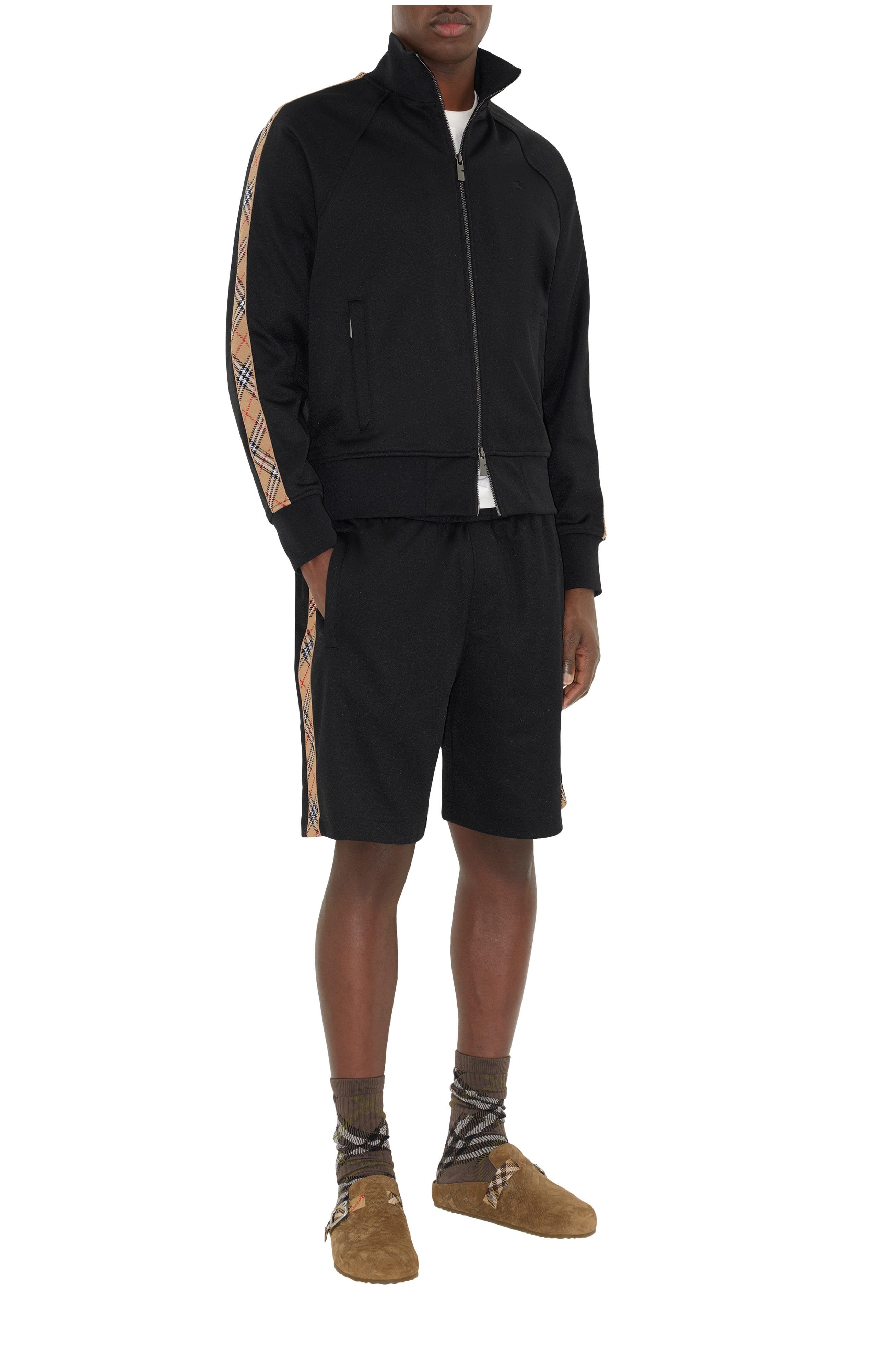 A track jacket made from a cotton blend jersey, framed with Burberry Check taping in our signature sand colourway. The funnel-neck style is cut to a relaxed fit and embroidered with a tonal Equestrian Knight Design.||Funnel neck|Side zip pockets|Embroidered Equestrian Knight Design at chest|Rib-knit trims Relaxed fit: a looser cut than our regular fit. Length: 69cm/27.1in (size UK M) Model's height: 190cm/6ft 3in. Model wears size UK M 54% polyester, 46% cotton Panels: 81% polyester, 16% polyamide, 3% elastane Trim: 80% polyester, 17% polyamide, 3% elastane Pocket lining: 100% cotton Machine wash Made in Portugal