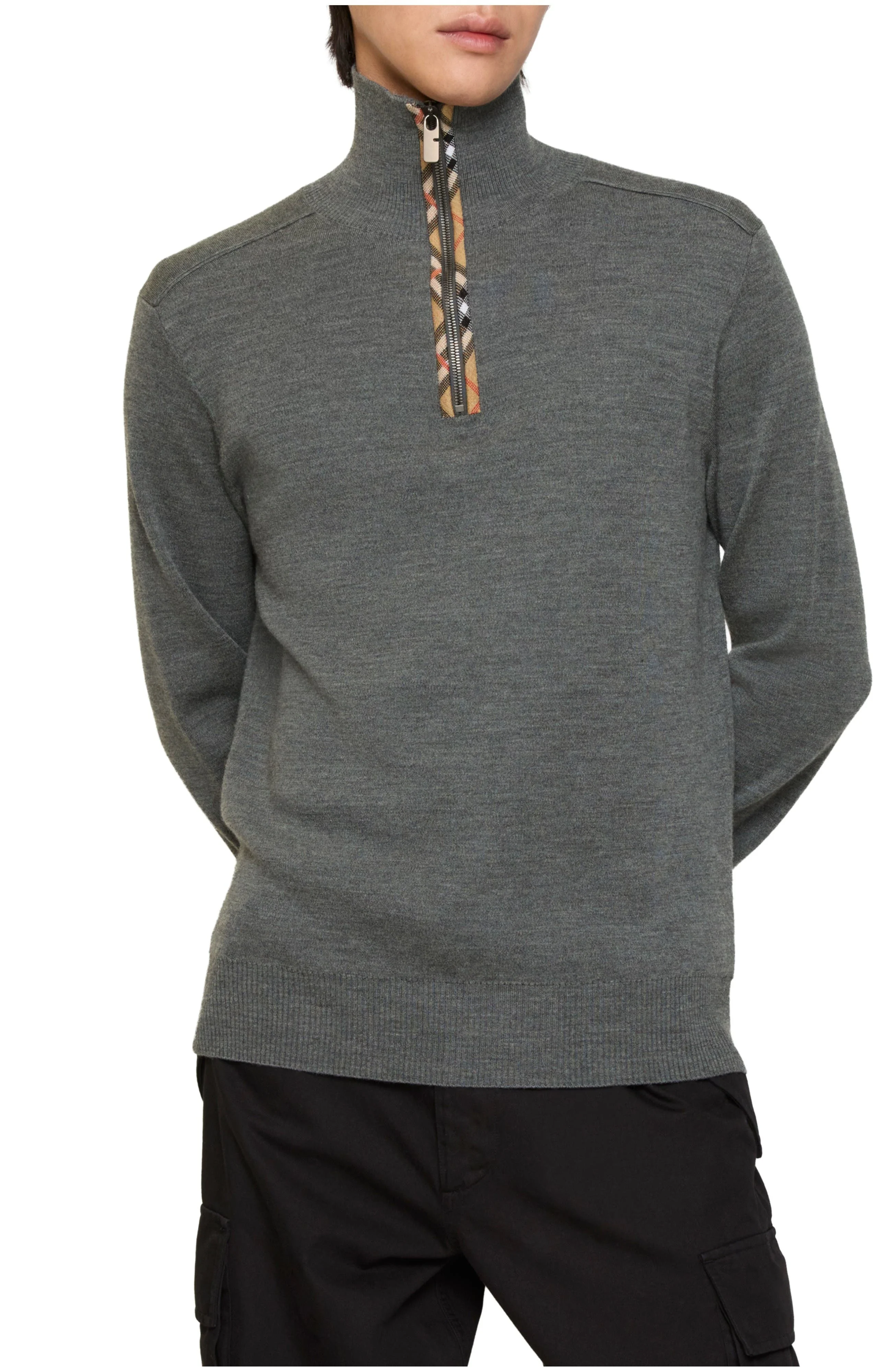 A funnel-neck sweater knitted from lightweight wool, cut to a regular fit. The style is detailed with a B-cut zip pull and Burberry Check trims in our signature sand beige colourway.||Zip closure|Rib-knit trims Regular fit. Fits true to size, take your normal size. Length: 66.5cm/26.2in (size UK M) Model’s height: 185cm/6ft 1in. Model wears size UK M 100% wool Trims: 89% wool, 10% polyamide, 1% elastane; 91% cotton, 8% polyamide, 1% elastane; 98% wool, 1% elastane, 1% polyamide Specialist dry clean Imported