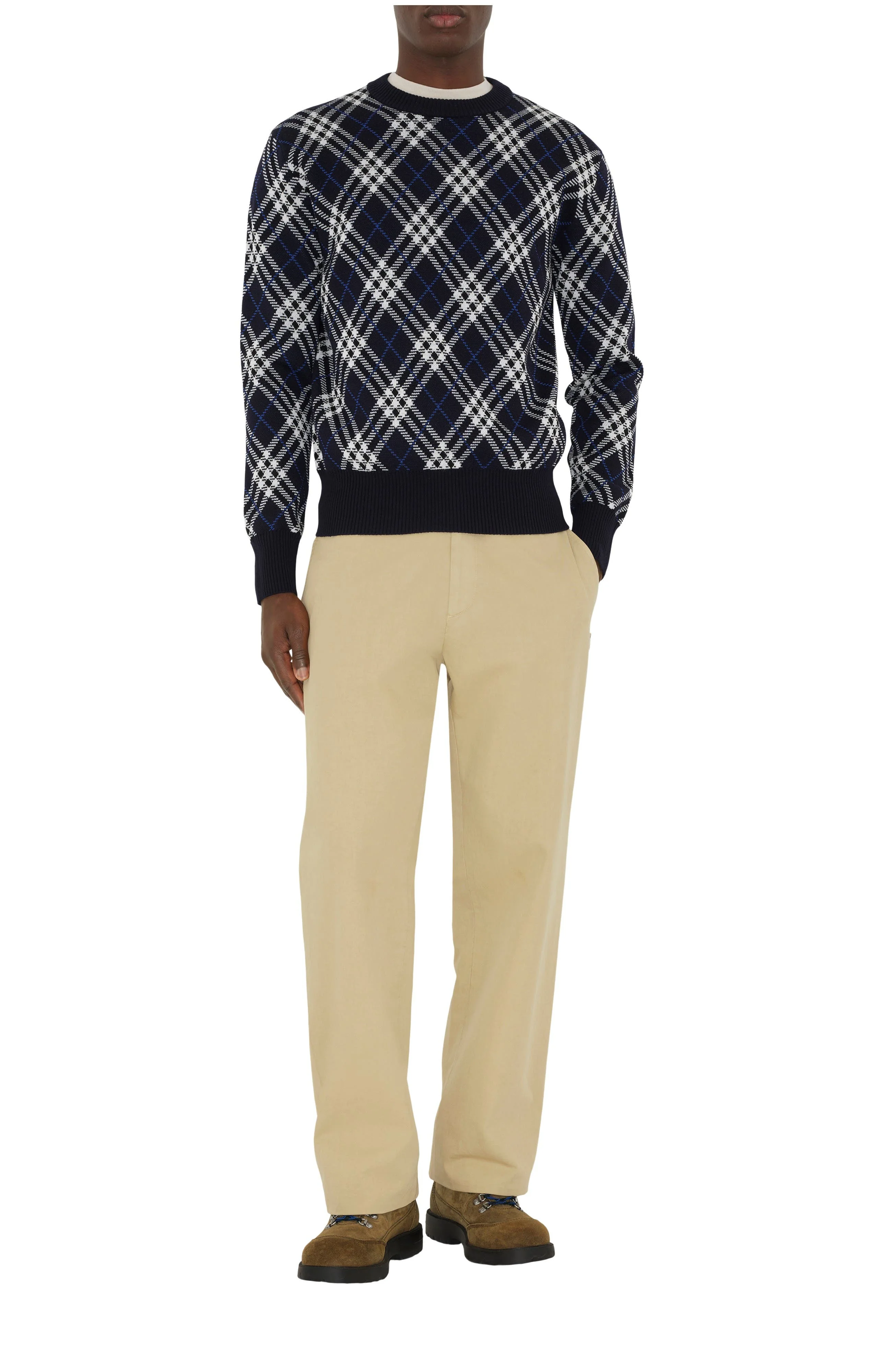 A crew-neck sweater in a wool blend, jacquard-knitted with the Burberry Check. The style is cut to a regular fit.||Rib-knit trims Regular fit. Fits true to size, take your normal size. Length: 68.5cm/27in (size UK M) Model’s height: 190cm/6ft 3in. Model wears size UK M 92% wool, 8% polyester Trim: 93% wool, 6% polyamide, 1% elastane Specialist dry clean Imported