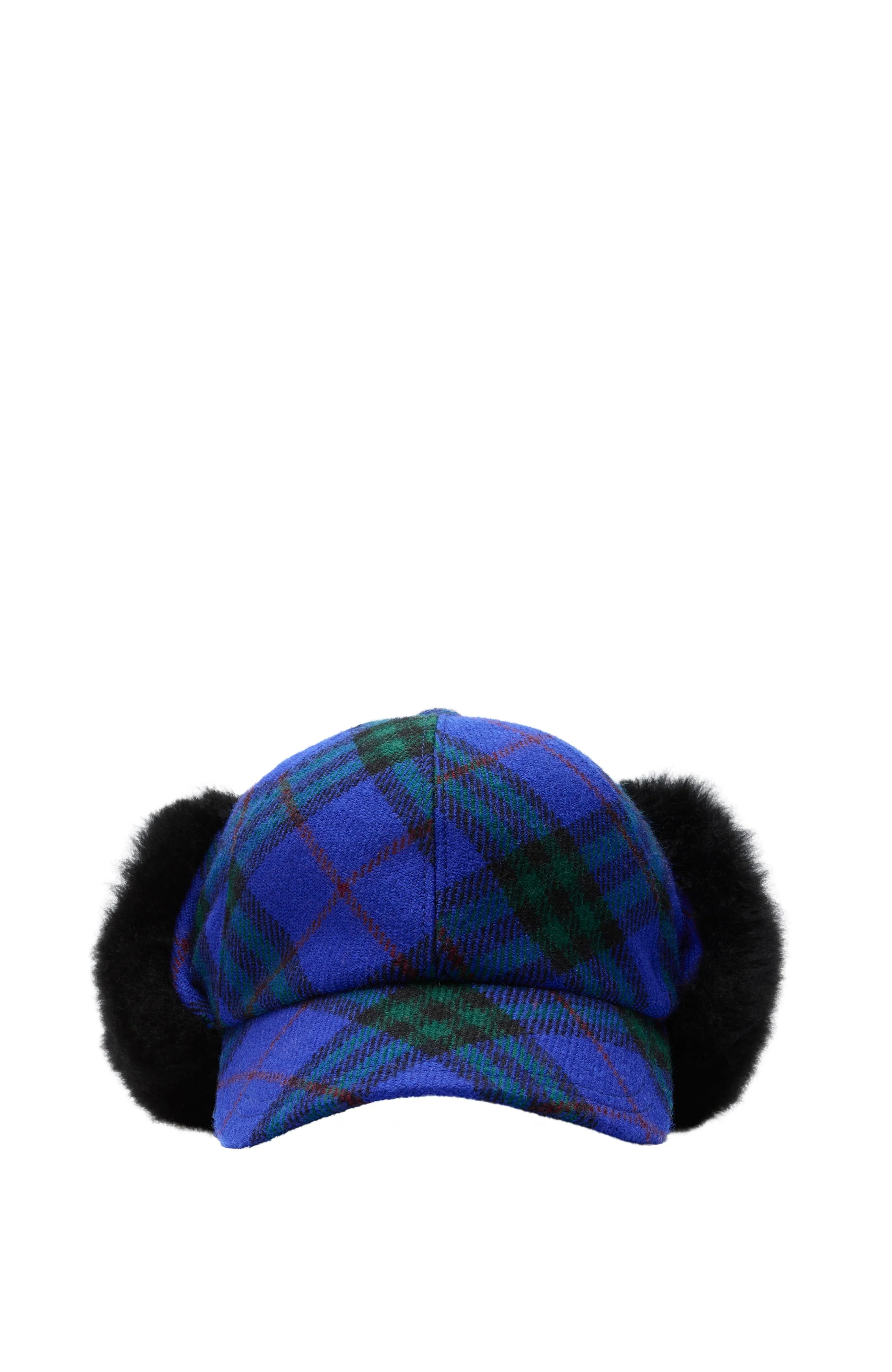 A padded cap made in Italy from wool flannel woven with the Burberry Check in signature Knight Blue. Inspired by trapper hats, the style features soft shearling-lined side panels with a shield-shaped buckle at the strap.||Adjustable buckled strap|Engraved Burberry lettering at buckle Outer: 100% wool Trim: 100% real farmed dyed lamb shearling, ovis aries, country of origin: Spain Lining: 100% cotton Filling: 100% polyester Made in Italy
