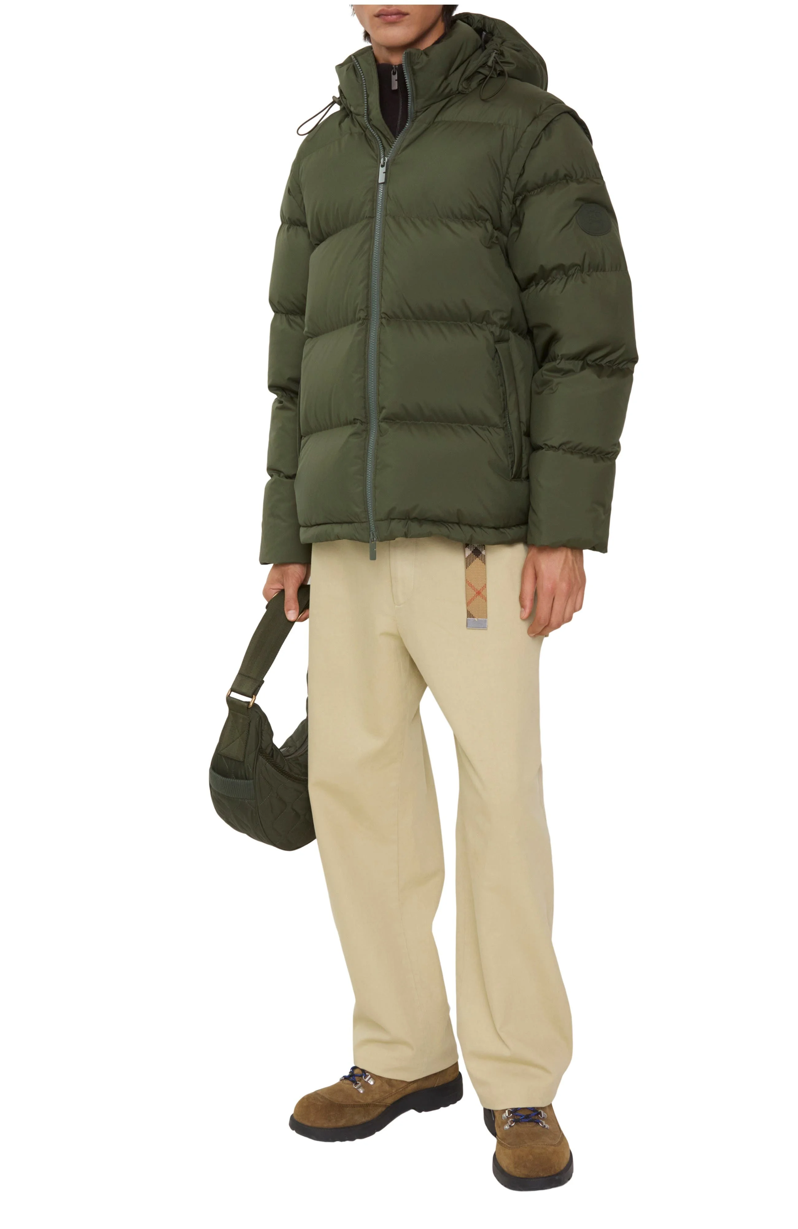 A puffer jacket filled with goose down and insulating fibres, appliqued with our Knight stamp – an archival motif from the 1980s. Detachable sleeves switch the design from a jacket to a gilet. The style is cut to a relaxed fit and features a Burberry Check wool lining at the detachable hood and collar.||Two-way zip closure|Detachable drawcord hood|Detachable sleeves|Side zip pockets|Drawcord hem|Storm cuffs|Burberry Check lining at hood and collar|Silicone patch with Equestrian Knight Design at sleeve|Comes with a garment bag Relaxed fit: a looser cut than our regular fit. Length: 72.7cm/28.6in (size UK M) Model’s height: 187cm/6ft 2in. Model wears size UK M Outer: 100% polyester bonded to 100% polyester Trim: 79% polyester, 20% polyamide, 1% elastane Lining: 100% polyamide Hood and collar lining: 100% wool Filling: 90% goose down, 10% goose feathers Wadding: 100% polyester fibres Machine wash Imported
