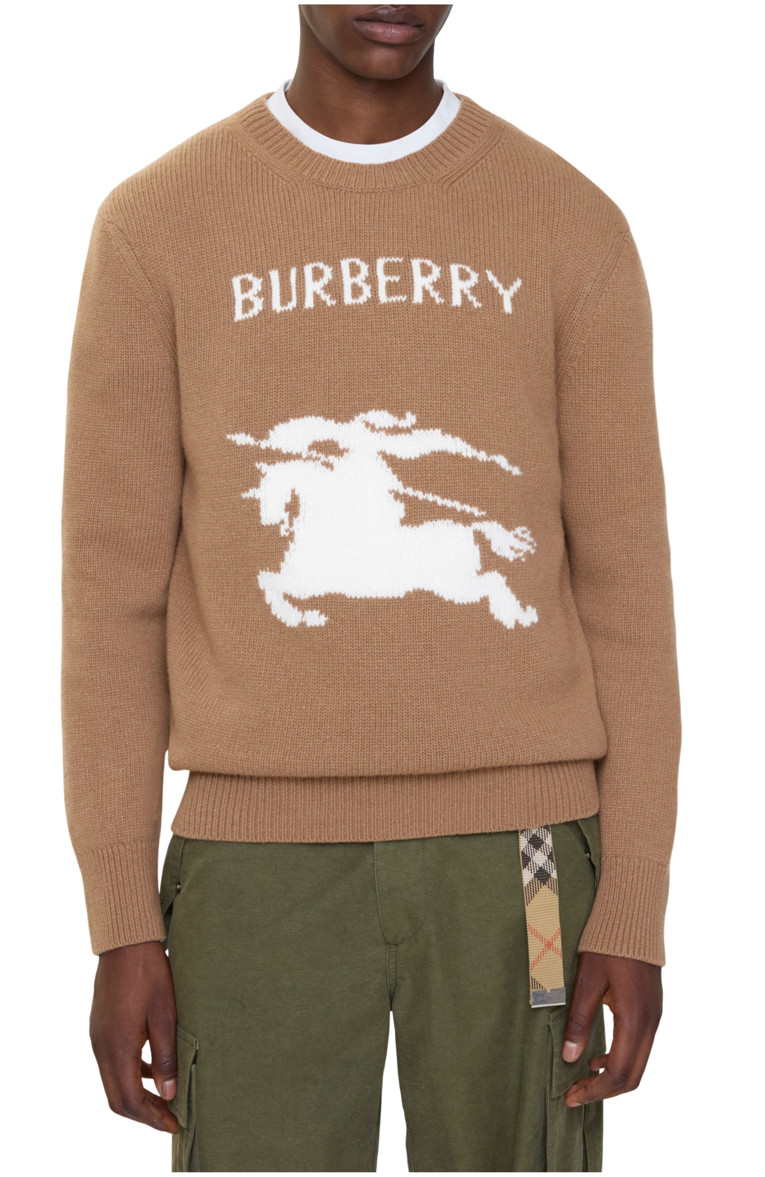 An Italian-made sweater in heavyweight wool cashmere, knitted with a contrasting Equestrian Knight Design and logo. The crew-neck style is cut to a regular fit.||Rib-knit trims|Knitted Burberry lettering at front Regular fit. Fits true to size, take your normal size. Length: 68cm/26.8in (size UK L) Model’s height: 188cm/6ft 2in. Model wears size UK L 71% wool, 29% cashmere Trim: 70% wool, 28% cashmere, 1% elastane, 1% polyamide Specialist dry clean Made in Italy