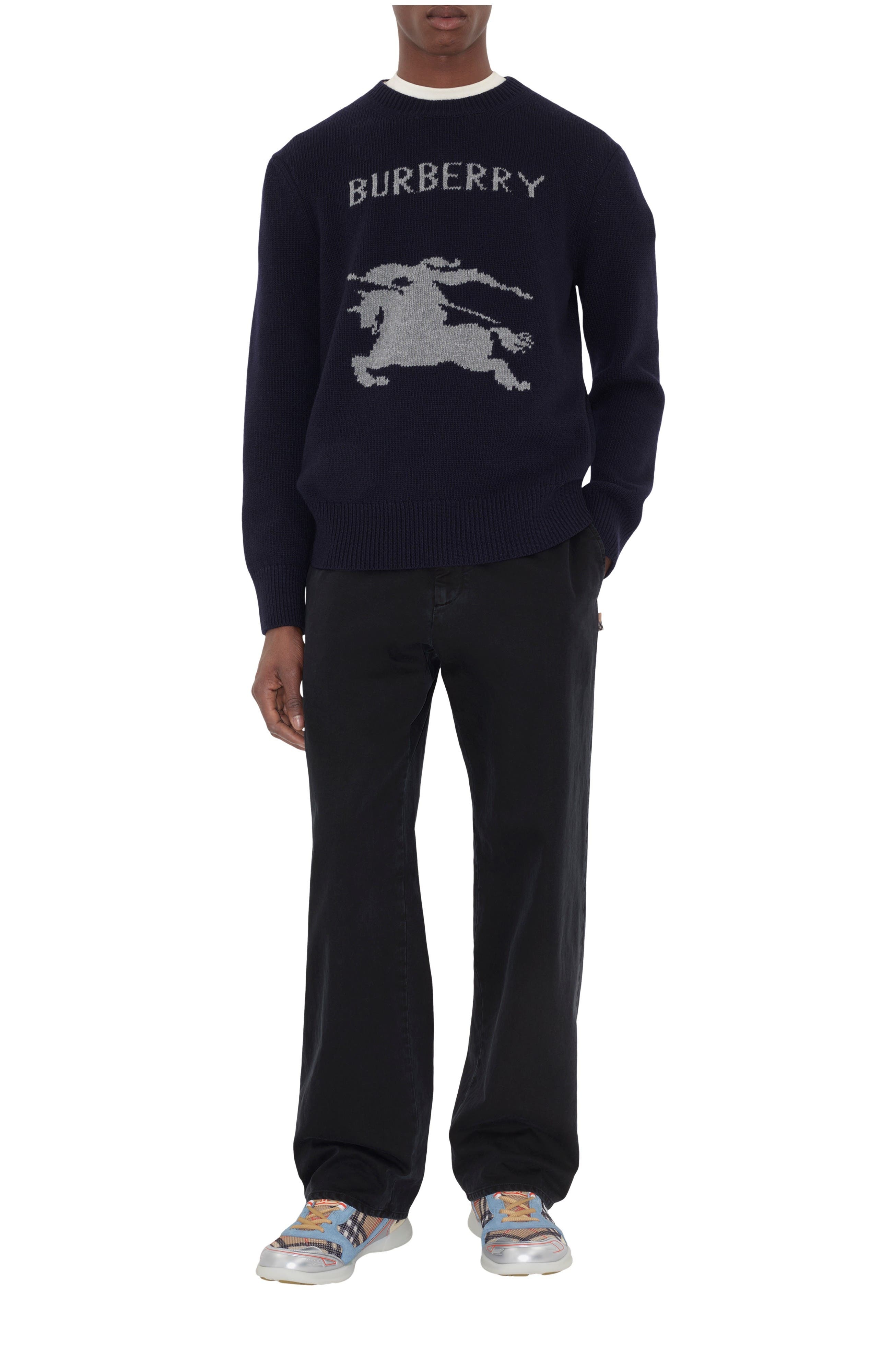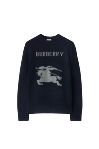 An Italian-made sweater in soft wool cashmere, knitted with a contrasting Equestrian Knight Design and logo. The crew-neck style is cut to a regular fit.||Rib-knit trims|Knitted Burberry lettering at front Regular fit. Fits true to size, take your normal size. Length: 66.5cm/26.1in (size UK M) Model's height: 184cm/6ft. Model wears size UK M 71% wool, 29% cashmere Trim: 70% wool, 28% cashmere, 1% elastane, 1% polyamide Specialist dry clean Made in Italy
