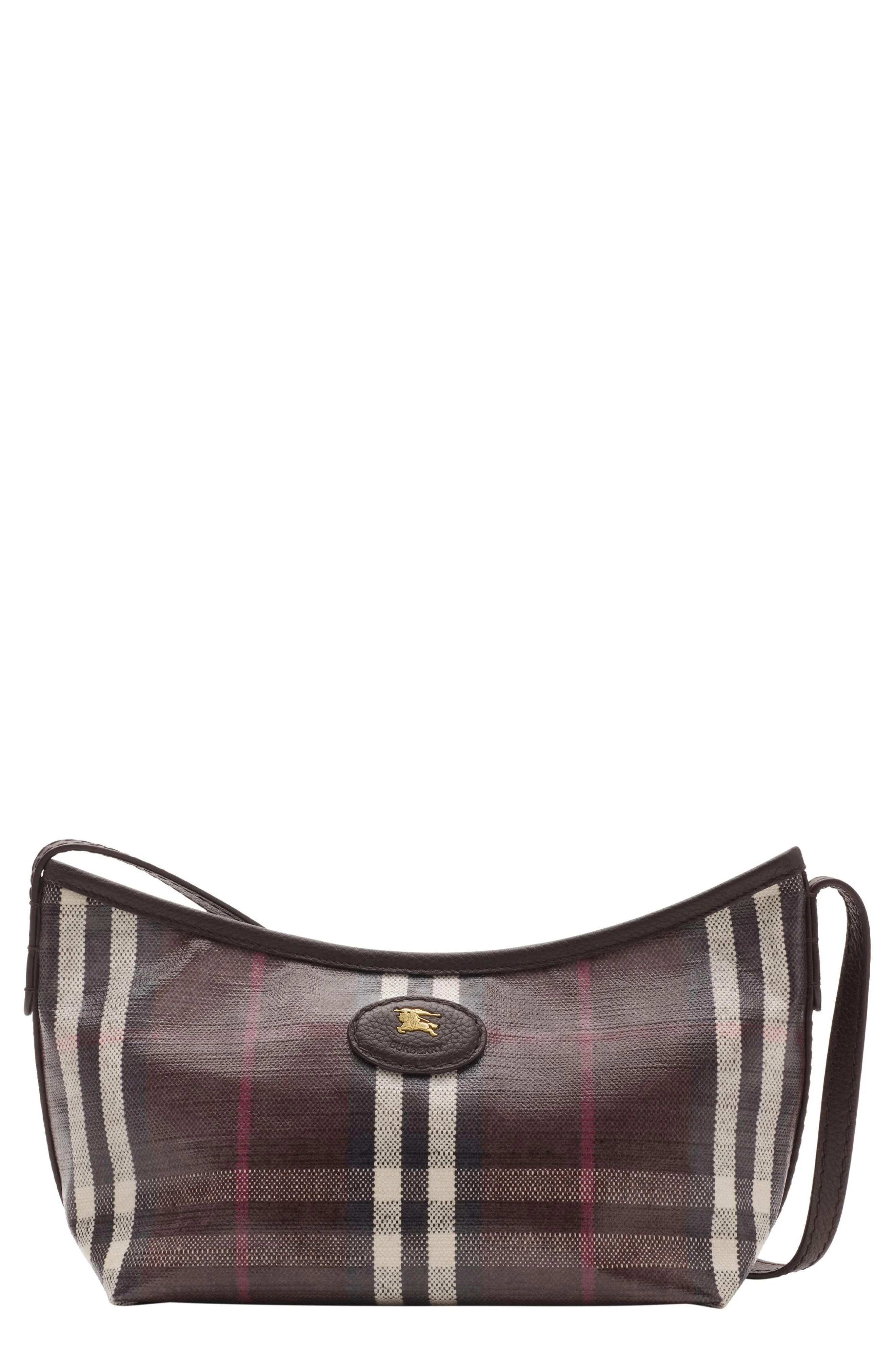 Rooted in the outdoors, this check-patterned shoulder bag is made in a compact silhouette from cotton-linen canvas and features a coated finish inspired by the label's iconic rainwear. The lightweight design is detailed with Burberry's Knight stamp, an archival motif first seen in the '80s. 10" x 4 3/4" x 6 1/4" 9" strap drop Top zip closure Shoulder strap Cotton lining Textile with leather trim Imported Designer Handbags