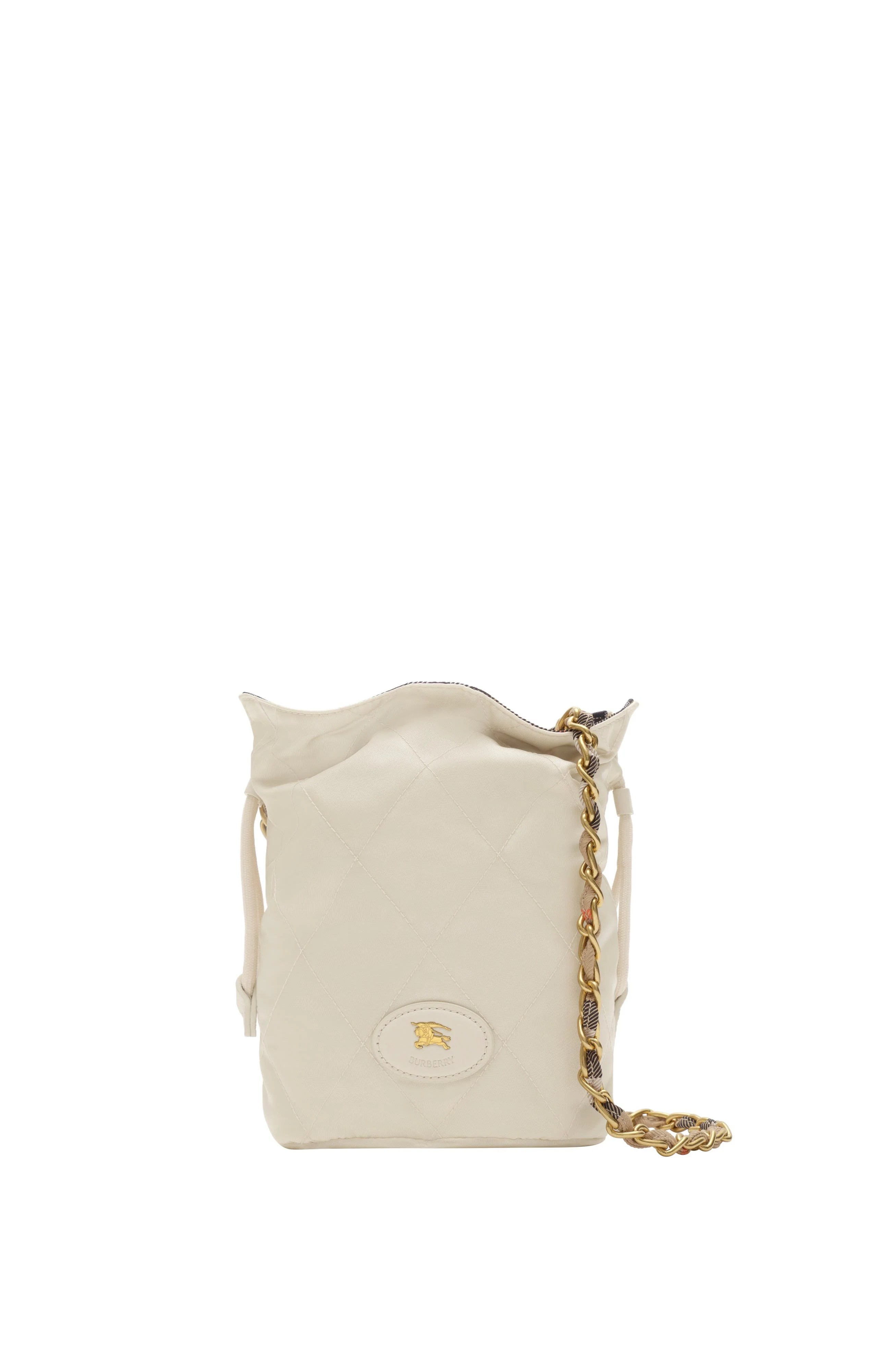 Inspired by country pursuits, a softly structured Horseshoe pouch in a quilted nylon blend with a Burberry Check lining. The design is detailed with leather trims and our Knight stamp, an archival motif first seen on Burberry bags in the 1980s. Carry crossbody or on the shoulder with the chain strap, intertwined with Burberry Check.||Chain strap|Drawcord closure|Hand-painted edges|Brushed metal hardware|Leather patch with Equestrian Knight Design at front|Burberry Check lining|Comes with a dust bag 14 x 10 x 19cm/5.5 x 3.9 x 7.5in Strap drop: 58cm/22.8in Outer: 90% polyamide, 10% acrylic Trim: 100% calf leather Lining: 100% polyamide Imported