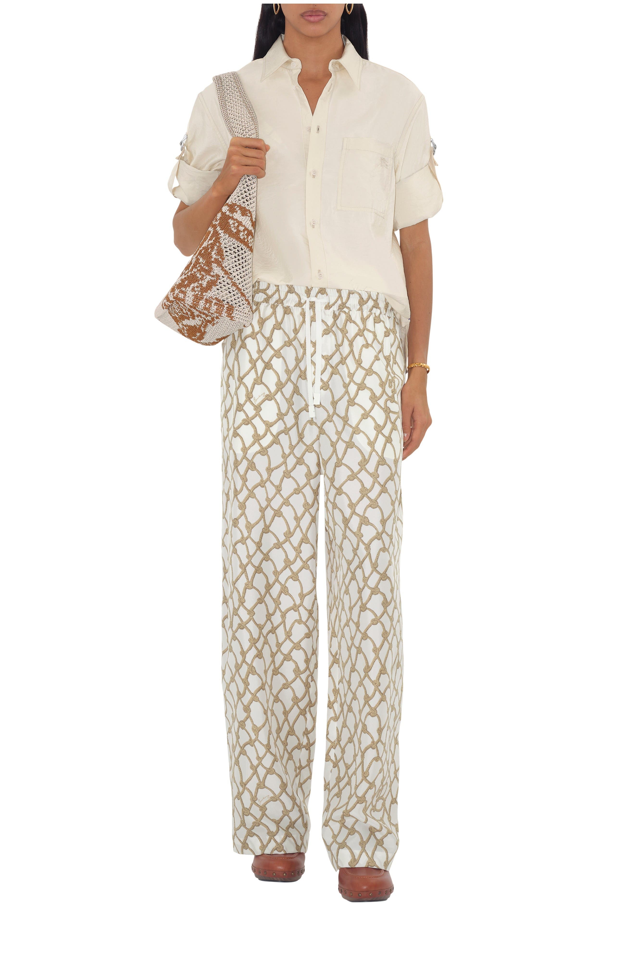 A pair of trousers made from Italian-woven silk poplin, printed with a design inspired by nautical knots. The drawcord style is cut to a relaxed fit.||Elasticated drawcord waist|Side slip pockets|Printed Burberry lettering at front Relaxed fit: a looser cut than our regular fit. Inside leg length: 82.5cm/32.5in (size UK 8) 100% silk Pocket lining: 100% silk Specialist dry clean Imported