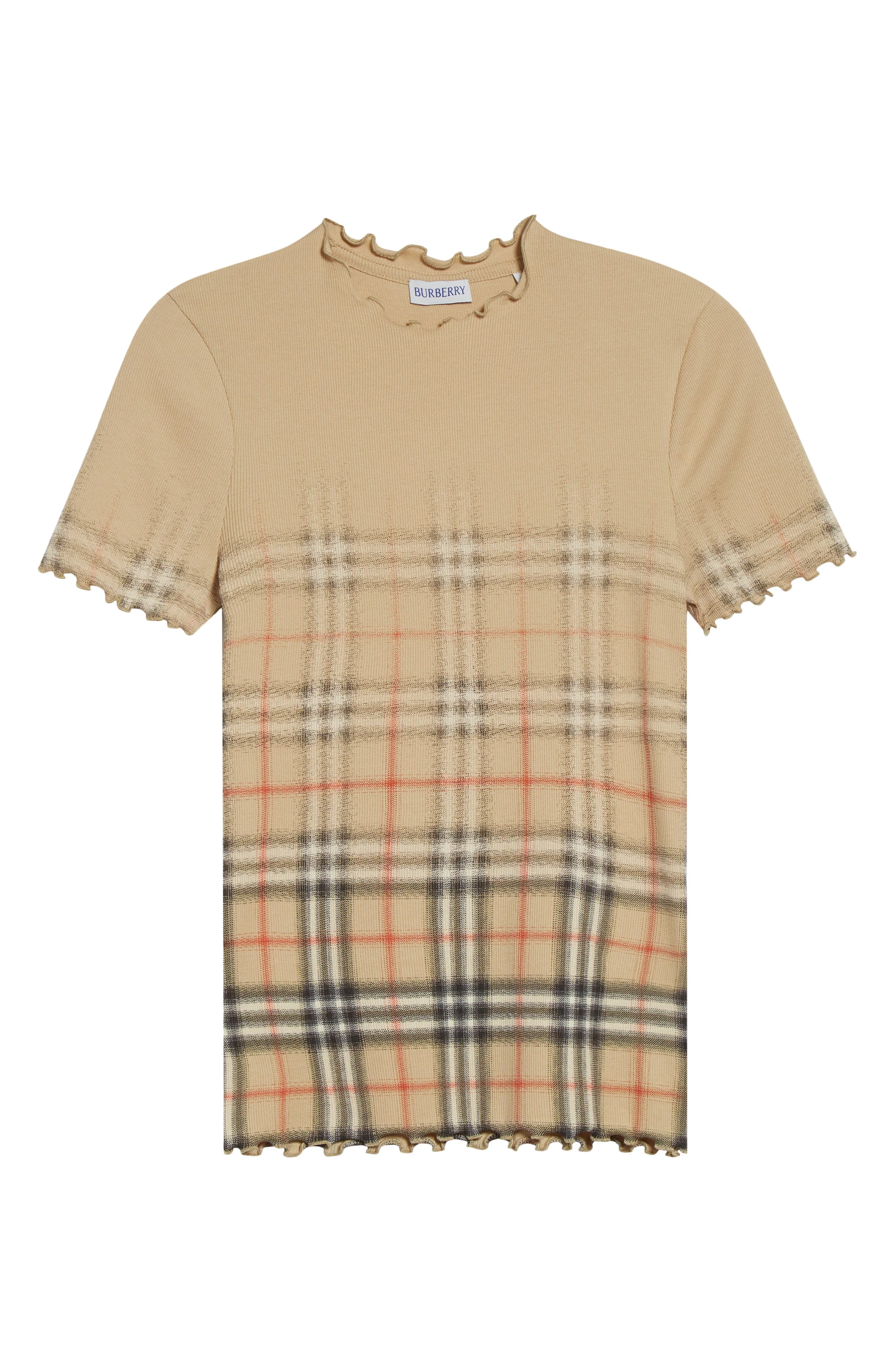 The iconic checks are reimagined in an ombre fade drifting across this fitted T-shirt traced with ruffled lettuce edging. 23 1/2" length (size Small) Crewneck Short sleeves 95% cotton, 5% elastane Dry clean Made in Portugal Designer Clothing