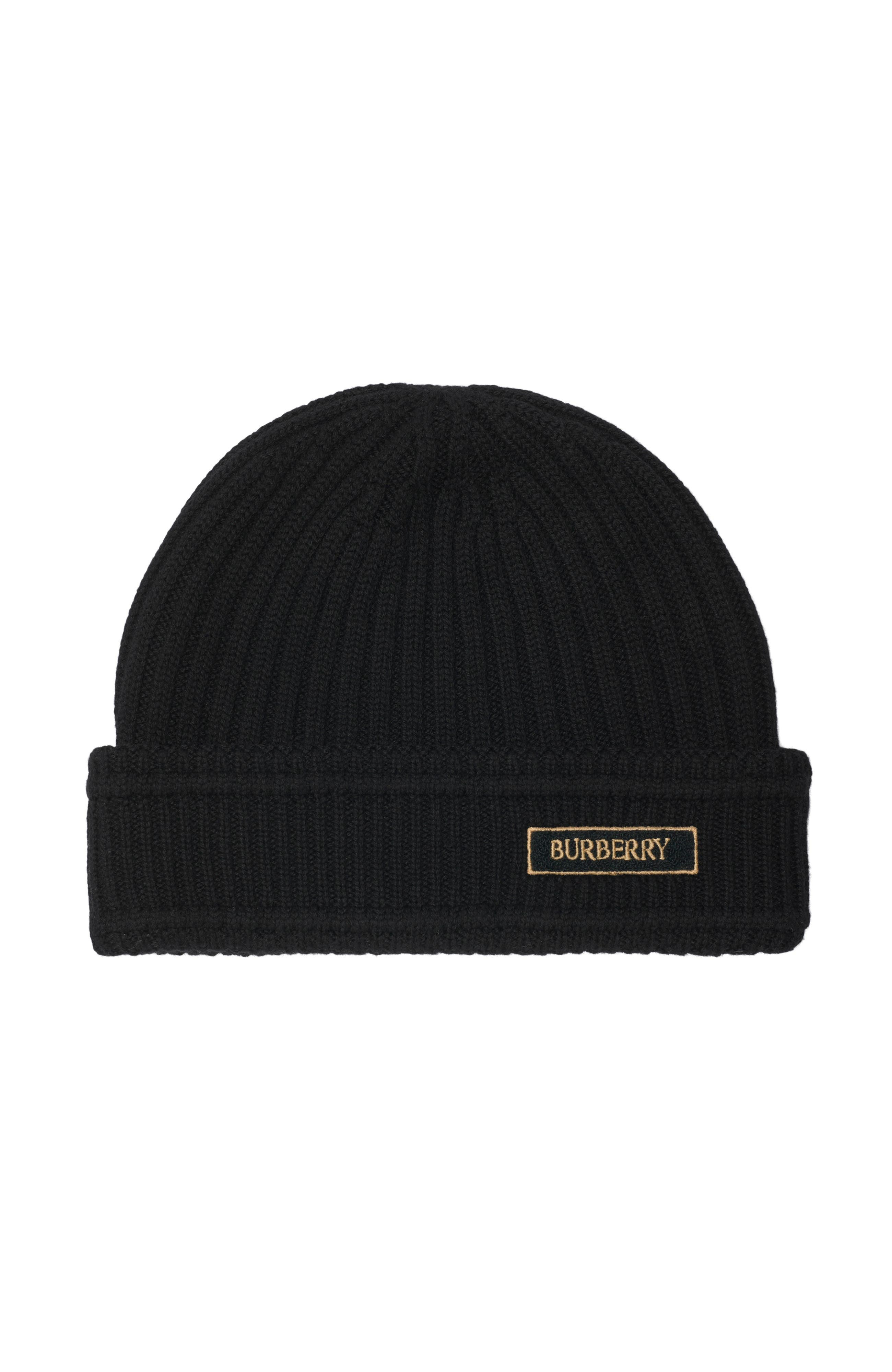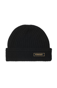 A rib-knit beanie in wool with a contrasting appliqued logo. 100% wool Specialist dry clean Made in UK