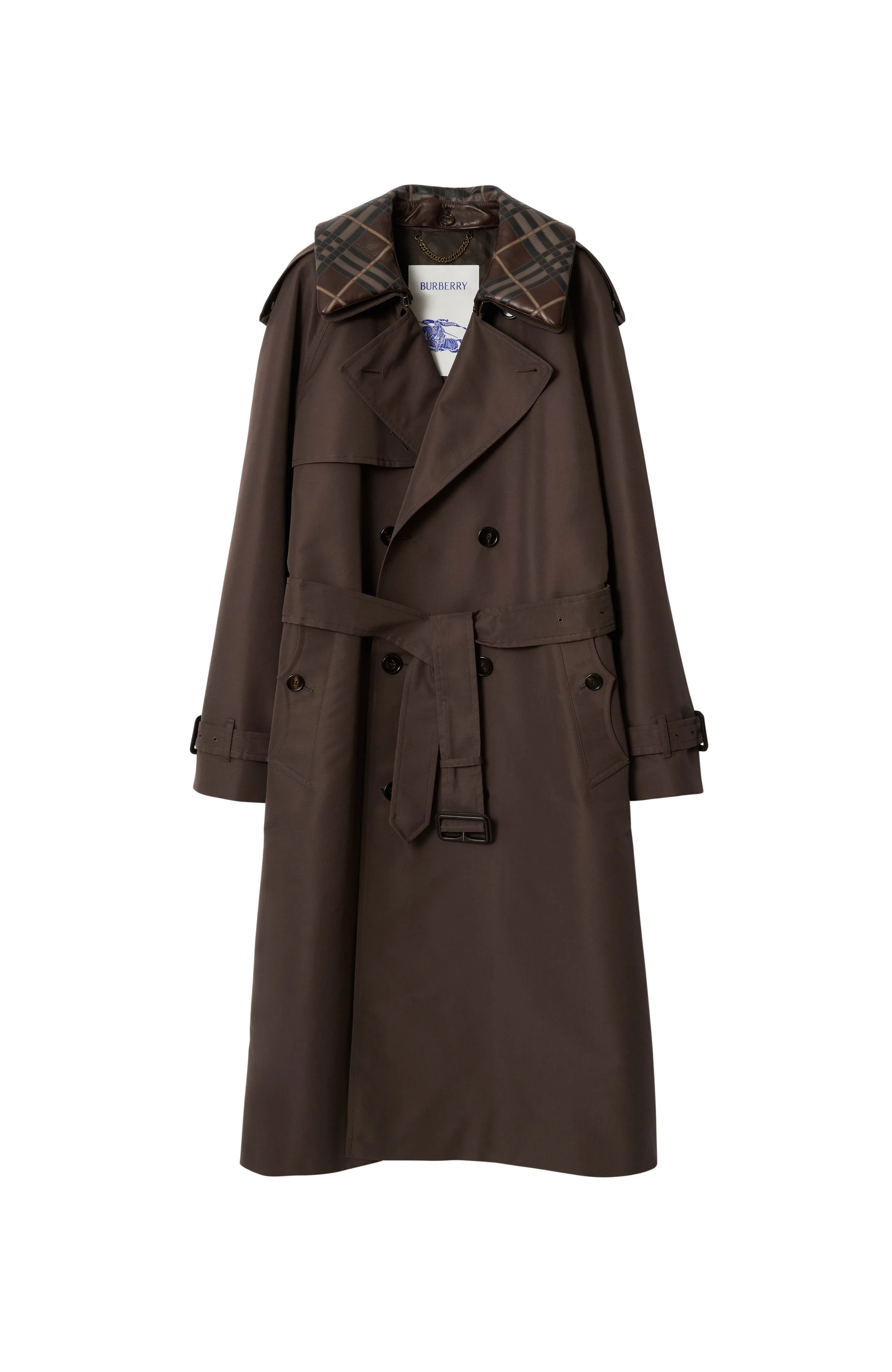 Debuted on the Burberry Winter 2025 runway, a trench coat made in Yorkshire from a fluid blend of silk and cotton. Panels of leather are intricately cut and hand-stitched to form an intarsia Burberry Check collar. A relaxed fit and raglan construction give a softer line at the shoulders, while an archival trench inspires the curlicue shape of the pockets. Adjust the shape with the B buckle belt.||Double-breasted button closure|Detachable collar|Hook-and-eye collar closure|Throat latch|Epaulettes|B buckle belt|Side button welt pockets|Belted cuffs|Back button vent|Comes with a garment bag Relaxed fit: a looser cut than our regular fit. Length: 125cm/49.2in (size IT 50) Outer: 58% silk, 42% cotton Detachable collar: 100% lambskin Lining: 100% cupro Buttons: buffalo horn Buckles: 100% calf leather Specialist dry clean Made in Yorkshire, England