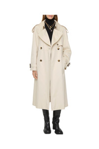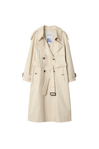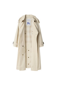 Adding volume to our signature rainwear, the Fitzrovia trench coat is made in Yorkshire from water-resistant gabardine, treated for a soft finish. The A-line style is cut to a relaxed fit, featuring wider sleeves and a fuller skirt, for a feminine silhouette. Raglan construction gives a softer line at the shoulders while an archival trench inspires the curlicue shape of the pockets. Inside is Burberry Check cotton lining in a seasonal clam beige colourway.||Double-breasted button closure|Hook-and-eye collar closure|Throat latch|Epaulettes|B buckle belt|Side button welt pockets|Belted cuffs|Back button vent|Burberry Check lining and undercollar|Comes with a garment bag Relaxed fit: a looser cut than our regular fit. Length: 115cm/45.3in (size UK 8) Outer: 100% cotton Lining: 100% cotton Sleeve lining: 100% cupro Buckles: 100% calf leather Buttons: buffalo horn Specialist dry clean Made in Yorkshire, England