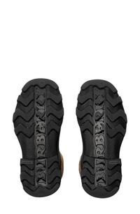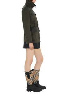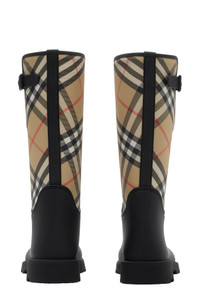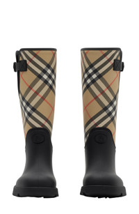 Take your rainy day look to icon status with this water-resistant rubber boot featuring a woven Burberry Check shaft and a chunky lug sole with archival lettering. 12 3/4" shaft; 14 1/4" calf circumference Pull-on style with adjustable, buckled straps Water resistant Rubber and synthetic upper/synthetic and textile lining/rubber sole Made in Italy Designer Shoes