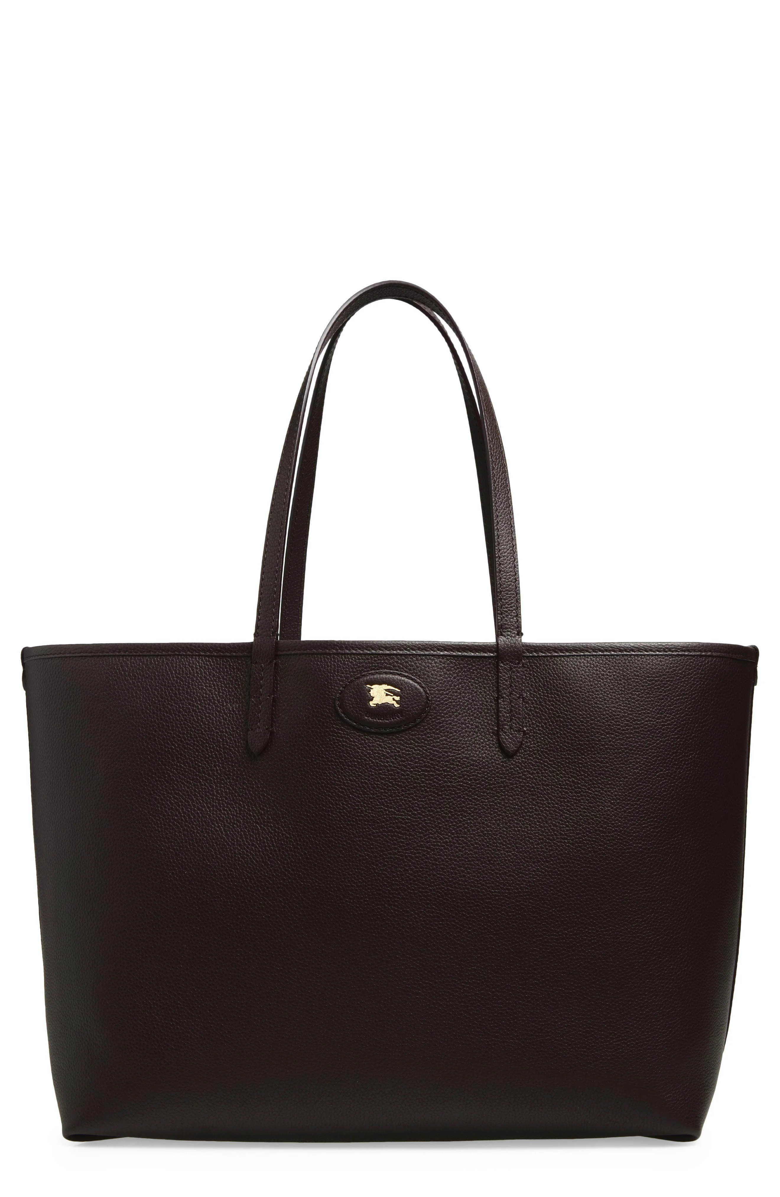 A house-signature Equestrian Knight gallops across the front of this reversible tote that switches from classic pebbled leather to cotton-blend canvas patterned with instantly recognizable checks. 15"W x 12"H x 6 1/2"D 10" handle drop Open top Top carry handles Removable tethered zip pouch Leather/textile Made in Italy Designer Handbags