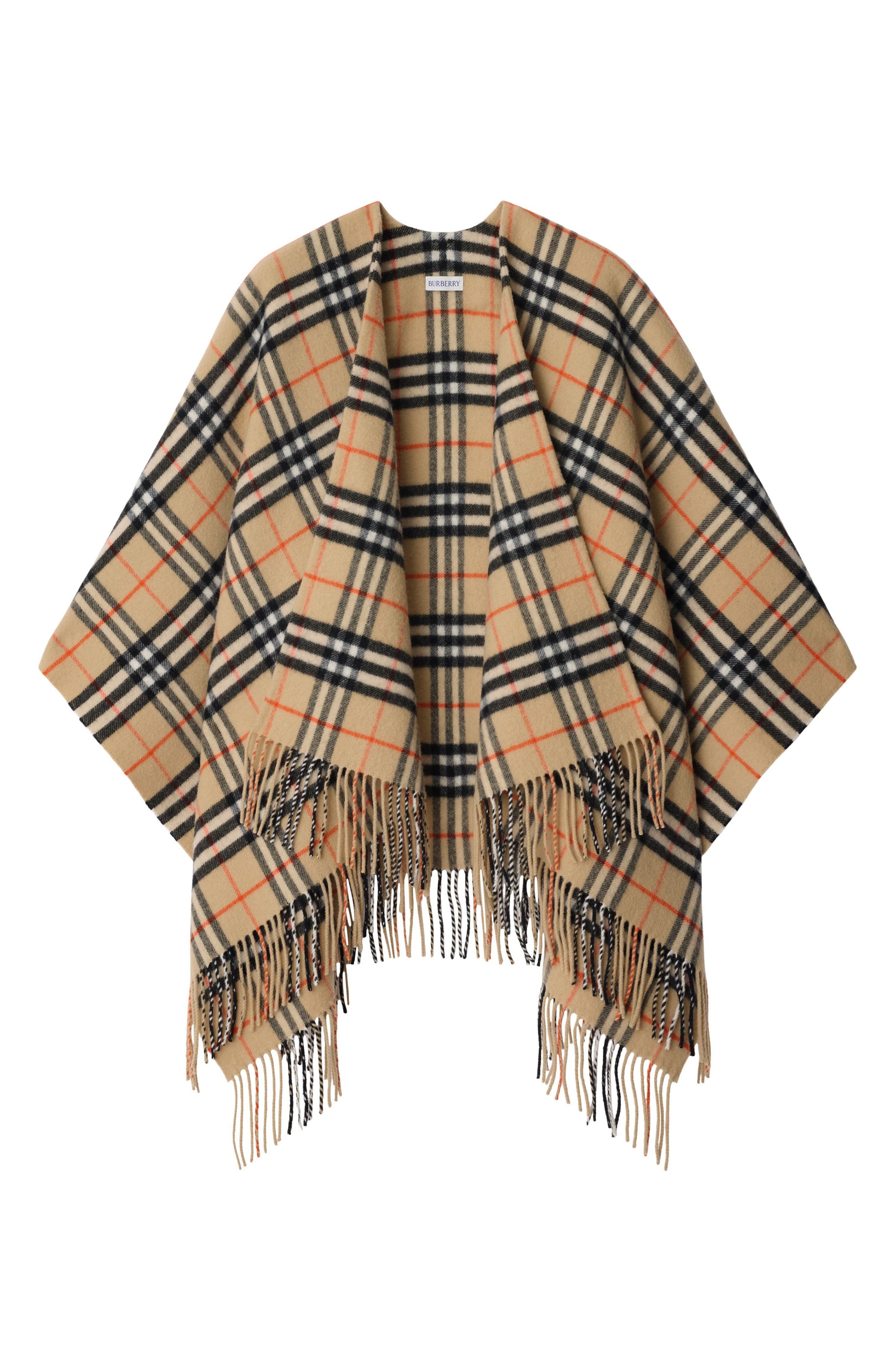 Classic Burberry Check cloaks this timeless cape woven in a 200-year-old Scottish mill from a sumptuous wool-cashmere blend, then finished with a wash in pure local spring water for unparalleled softness. 76" x 37 1/2" 90% wool, 10% cashmere Dry clean Made in the UK