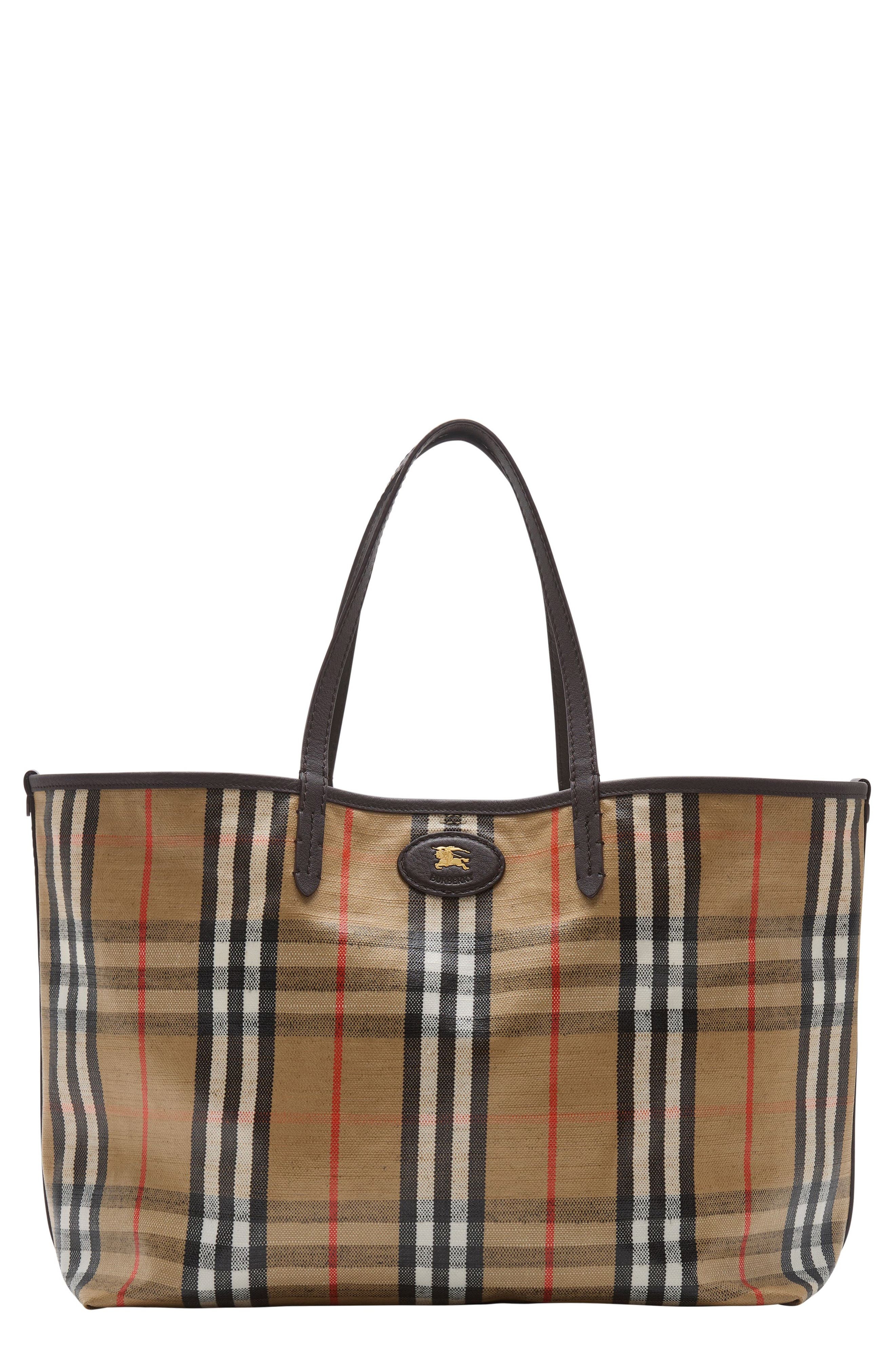 Rooted in the outdoors, this Burberry Check-jacquard tote bag is made in Italy from cotton-linen canvas and features a coated finish inspired by rainwear. The unlined design is detailed with Burberry's Knight stamp, an archival motif first seen in the '80s. 15"W x 11"H x 6 1/2"D 9 1/2” handle drop Snap closure Removable tethered pouch Textile with leather trim Made in Italy Designer Handbags