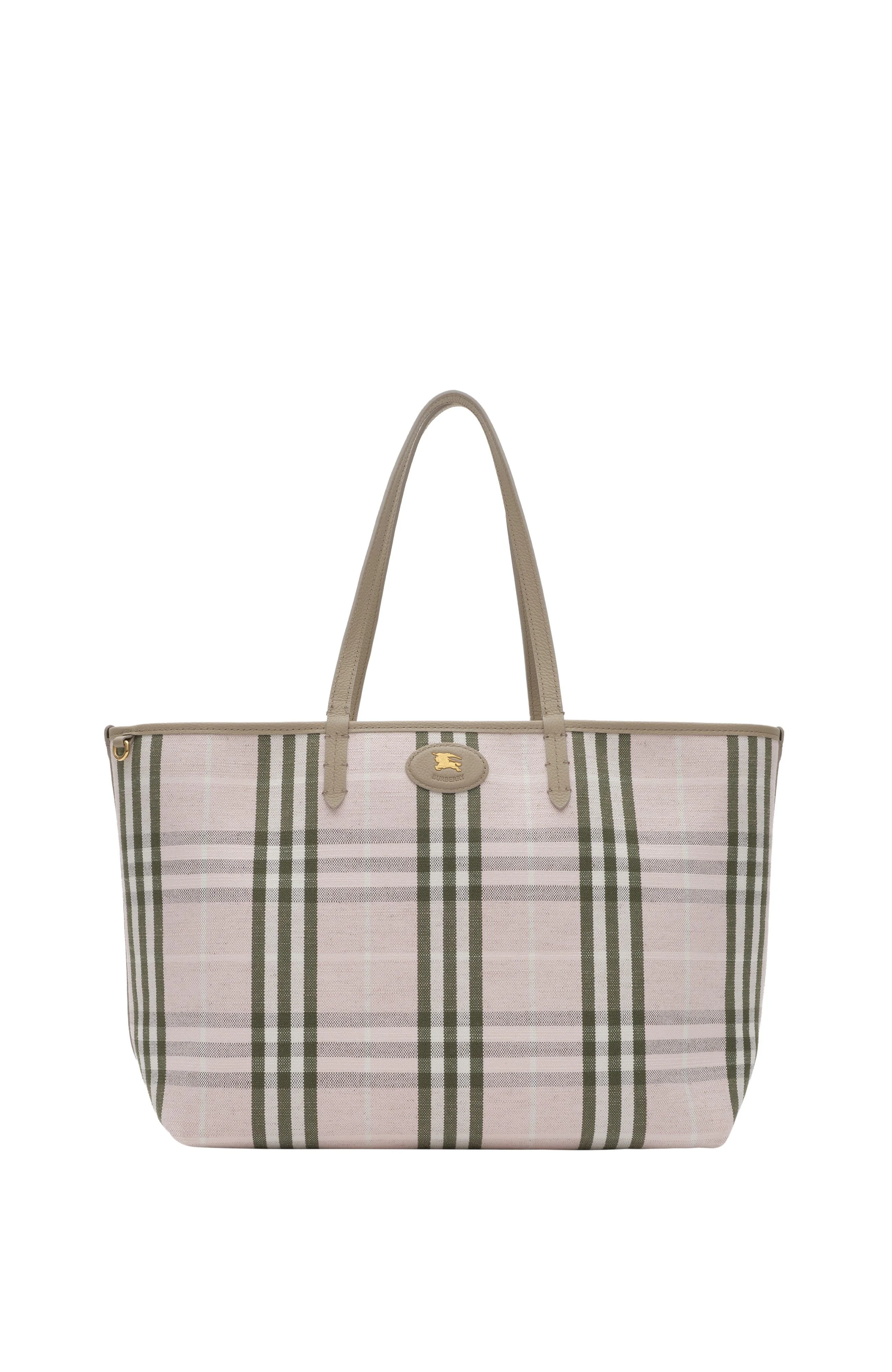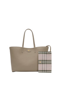 A spacious tote made in Italy from grainy calf leather, reversing to a Burberry Check cotton linen blend in seasonal mallow pink. The Bloomsbury collection is finished with a leather and metal Knight stamp, an archival motif first seen on Burberry bags in the 1980s. Comes with a detachable press-stud pouch to secure smaller items.||Top handles|Detachable pouch|Hand-painted edges|Brushed metal hardware|Leather patch with Equestrian Knight Design at front|Comes with a dust bag 37.5 x 17 x 30cm/14.8 x 6.7 x 11.8in Handle drop: 23cm/9.1in Outer: 100% calf leather Reverse: 69% cotton, 21% viscose, 10% linen Made in Italy