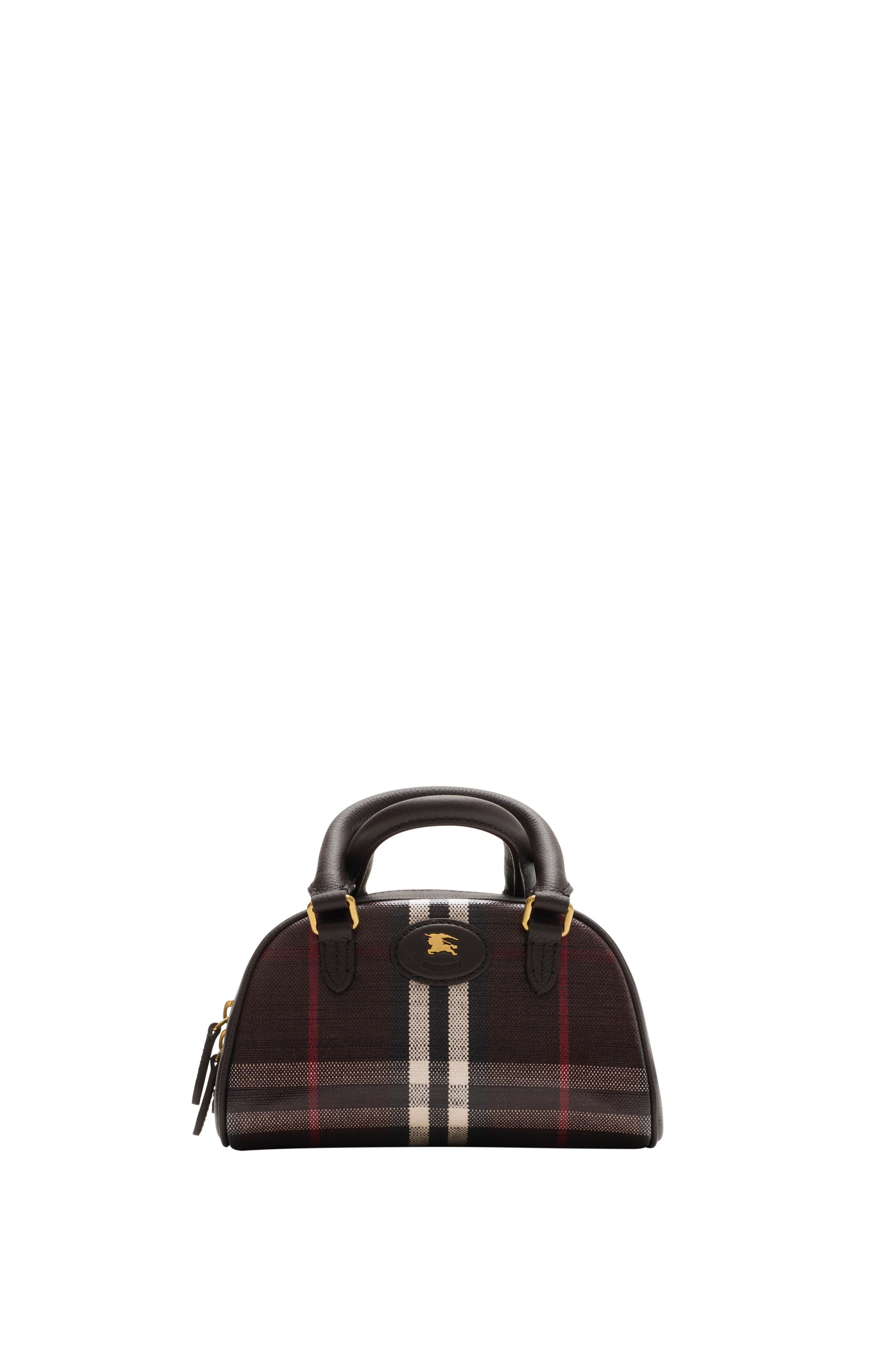 Rooted in the outdoors, our mini Highlands bowling bag is made in Italy from a cotton linen blend trimmed with smooth calf leather and lined in cotton. The fabric is jacquard-woven with the Burberry Check and has a coated finish inspired by rainwear. The design can be worn crossbody with the detachable strap and is finished with our Knight stamp, an archival motif first seen on Burberry bags in the 1980s.||Rolled leather top handles|Detachable, adjustable leather strap|Two-way zip closure|Hand-painted edges|Brushed metal hardware|Leather patch with Equestrian Knight Design at front|Cotton lining|Comes with a dust bag 19.5 x 9 x 12cm/7.7 x 3.5 x 4.7in Min. strap drop: 48cm/18.9in Max. strap drop: 62cm/24.4in 69% cotton, 21% viscose, 10% linen Trim: 100% calf leather Lining: 100% cotton Made in Italy