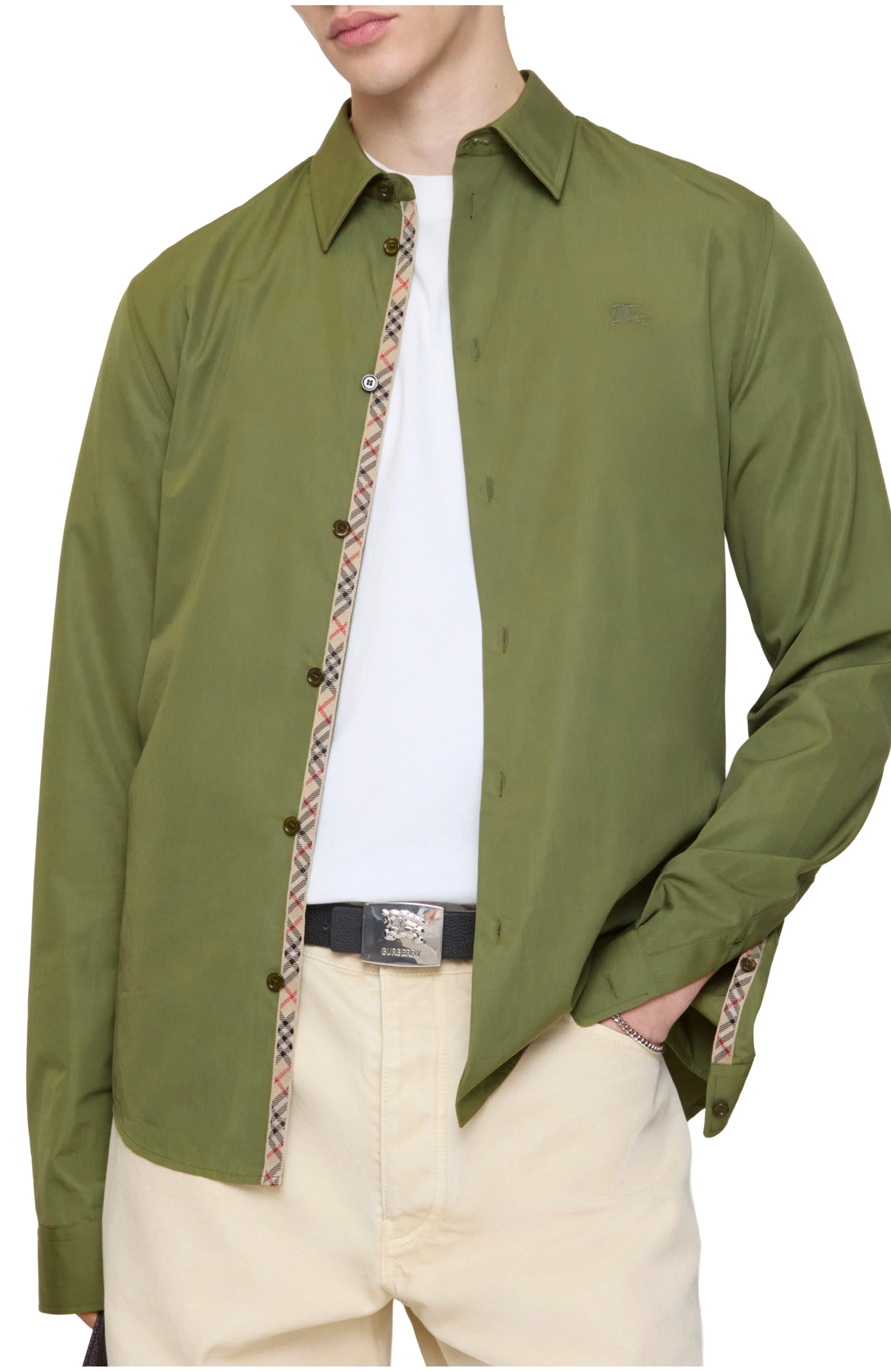 A long-sleeved shirt made from cotton poplin, lined with Burberry Check at the placket and cuffs in signature archive beige. The style is tailored to a regular fit and embroidered with a tonal Equestrian Knight Design.||Button closure|Point collar|Single-button cuffs|Curved hem|Embroidered Equestrian Knight Design at chest Regular fit. Fits true to size, take your normal size. Length: 78.5cm/30.9in (size UK M) Model’s height: 184cm/6ft. Model wears size UK M Outer: 100% cotton Lining panels: 100% polyester Buttons: mother-of-pearl Machine wash Imported
