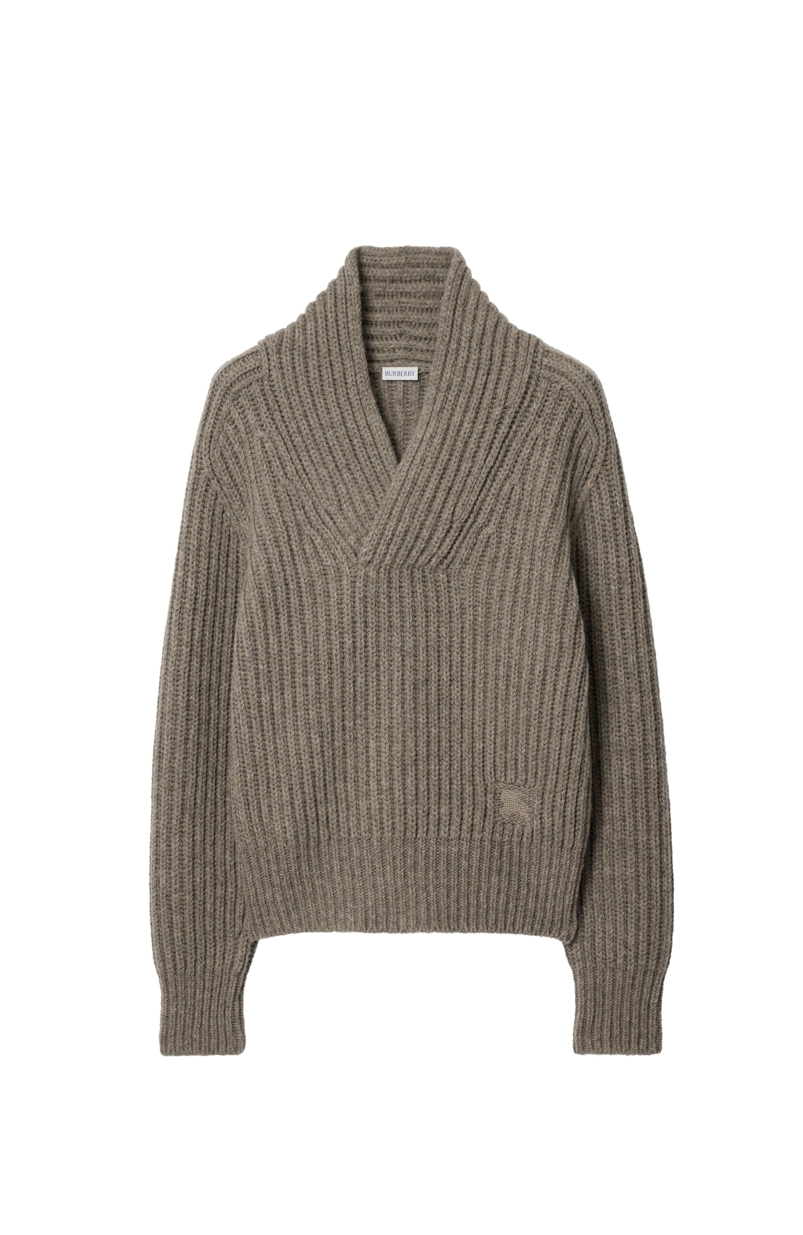 A chunky rib-knit sweater made in Italy from heavyweight wool, brushed on the inside for a soft finish. Debuted on the Burberry Winter 2025 runway, the silhouette is shaped with a shawl collar and features a cross-stitch Equestrian Knight Design at the hem. Regular fit. Fits true to size, take your normal size. Length: 65cm/25.6in (size UK L) 100% wool Trim: 98% wool, 1% elastane, 1% polyamide Specialist dry clean Made in Italy