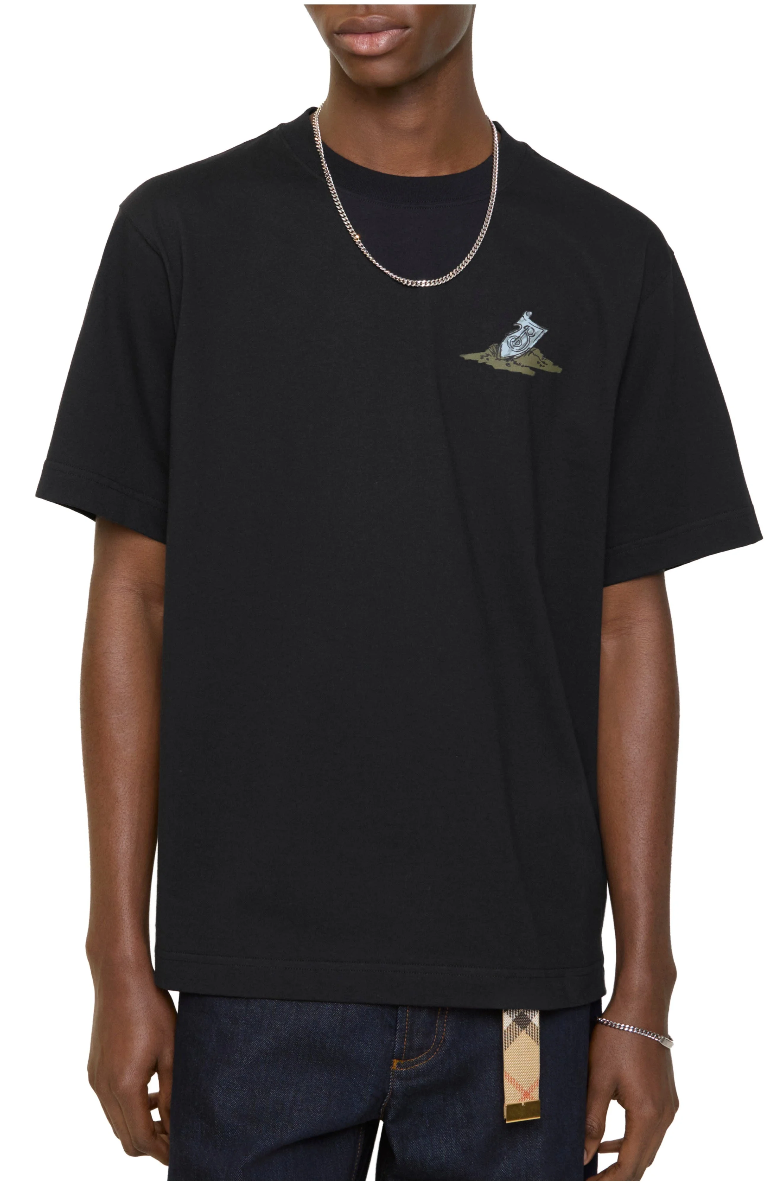 A crew-neck T-shirt cut to a relaxed fit from midweight cotton jersey. The design features an embroidered logo and is screen-printed with hand-drawn artwork depicting our Equestrian Knight resting in the shade of a tree.||Rib-knit neckline|Embroidered Burberry lettering at back Relaxed fit: a looser cut than our regular fit. Length: 74cm/29.1in (size UK L) 100% cotton Trim: 97% cotton, 3% elastane Machine wash Made in Portugal