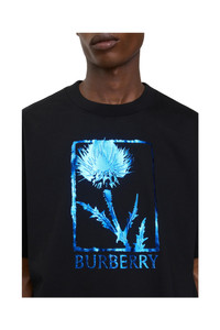 A T-shirt made from lightweight cotton jersey, cut to a relaxed fit. The style is printed with a metallic logo and thistle – a hardy wildflower synonymous with the British Isles.||Rib-knit neckline|Printed Burberry lettering at front Relaxed fit: a looser cut than our regular fit. Length: 74cm/29.1in (size UK L) Model’s height: 187cm/6ft 2in. Model wears size UK L 100% cotton Trim: 97% cotton, 3% elastane Machine wash Made in Portugal