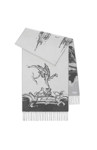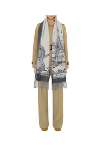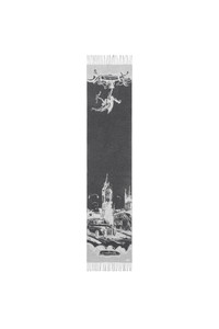 A cashmere scarf made in Italy, jacquard-woven with hand-drawn artwork inspired by London landmarks. The design depicts the statue of Anteros in Piccadilly Circus and the view from Westminster Bridge featuring Big Ben, a double-decker bus and a black taxi.||Rectangular|Fringing at both ends|Jacquard-woven Burberry lettering at ends 210 x 47cm/82.7 x 18.5in 100% cashmere Specialist dry clean Made in Italy