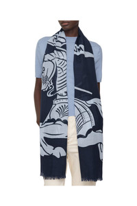 An Italian-made scarf in wool, screen-printed with the Equestrian Knight Design and our logo. The lightweight style is bordered with delicate fringing.||Rectangular|Eyelash fringing at edges|Printed Burberry lettering at corners 200 x 70cm/78.7 x 27.6in 100% wool Dry clean Made in Italy