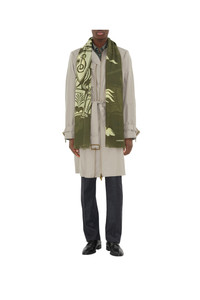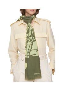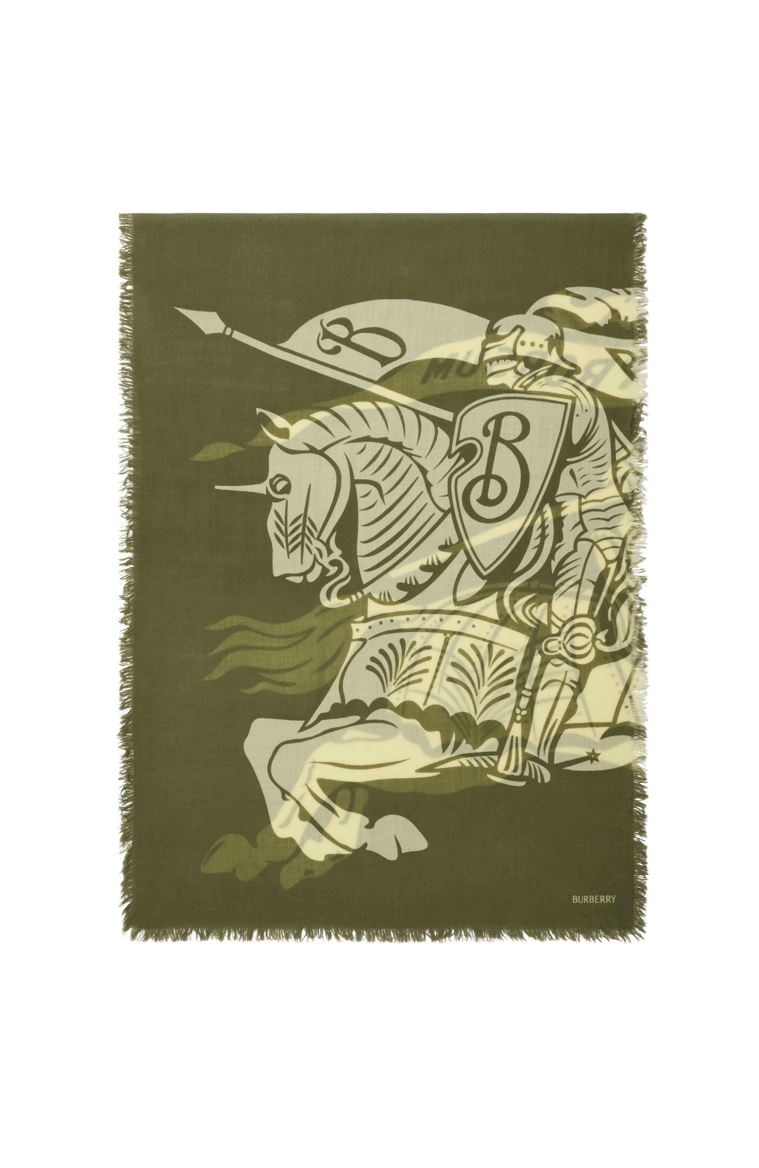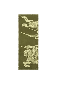 An Italian-made scarf in wool, screen-printed with the Equestrian Knight Design and our logo. The lightweight style is bordered with delicate fringing.||Rectangular|Eyelash fringing at edges|Printed Burberry lettering at corners 200 x 70cm/78.7 x 27.6in 100% wool Dry clean Made in Italy