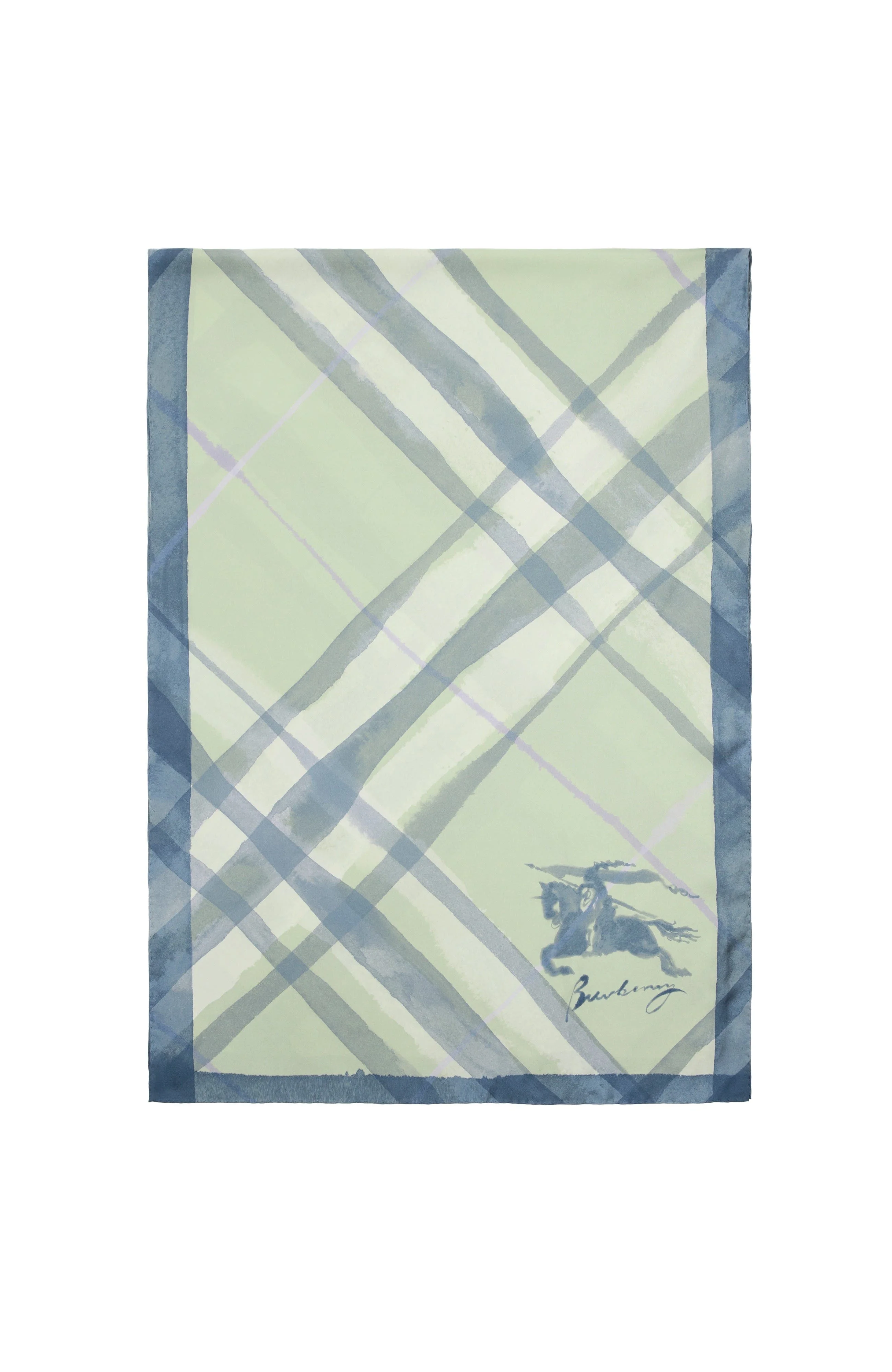 A scarf made in Italy from silk twill, printed with a watercolour-effect Burberry Check and our Equestrian Knight Design.||Rectangular|Hand-rolled edges|Printed Burberry lettering at corner 200 x 70cm/78.7 x 27.6in 100% silk Specialist dry clean Made in Italy