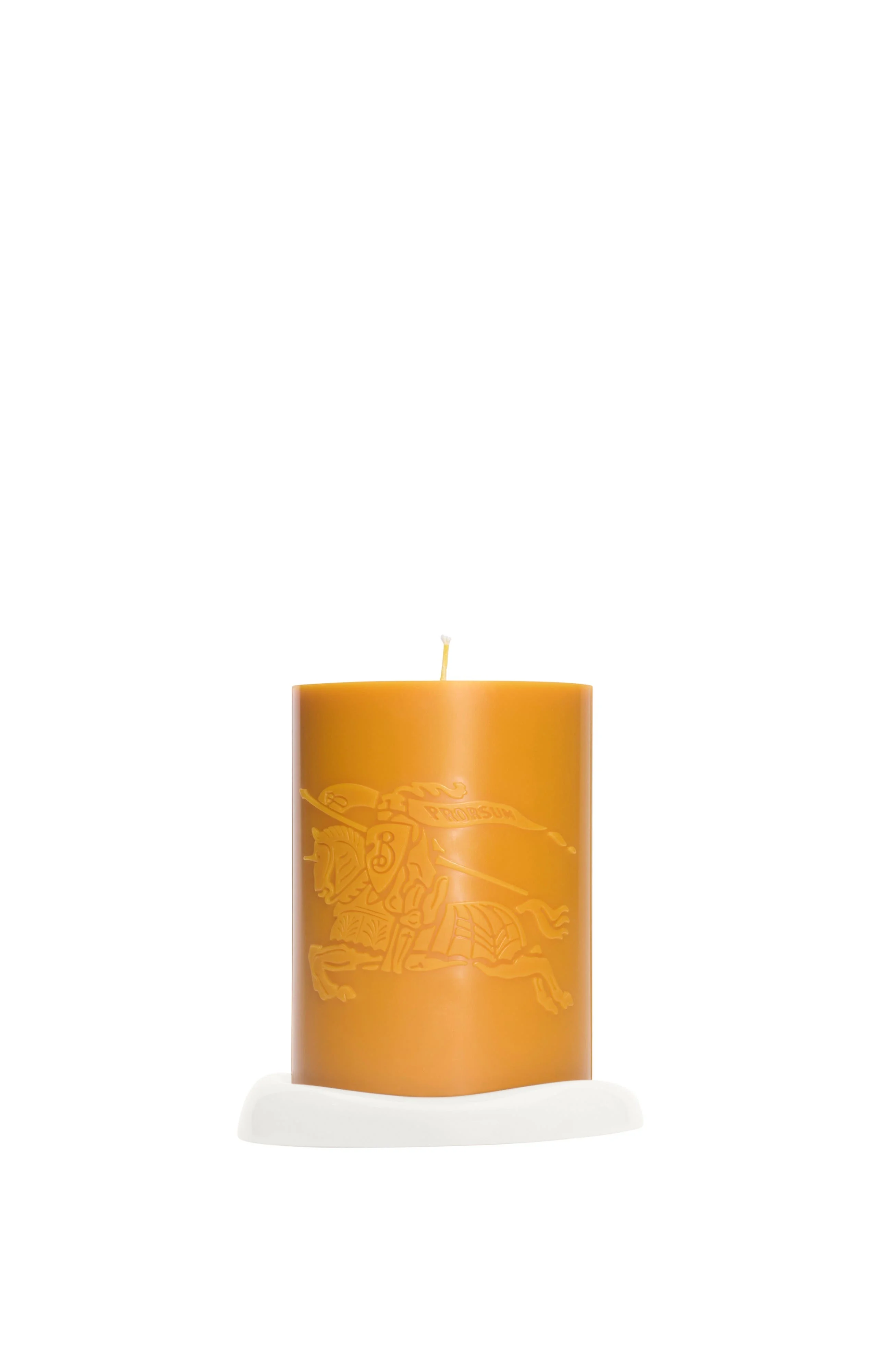A pillar candle scented with smoky notes of woodfire and spicy clove. Made in Italy, the candle is embossed with our Equestrian Knight Design and developed to burn through the centre to retain its shape. The candle is set on a fine bone china plate, made at a ceramics workshop in Staffordshire and hand-stamped at the base with the Burberry logo. Presented in a custom designed box, wrapped in a Burberry Check sleeve with an Equestrian Knight Design sticker to denote the scent inside.||Top notes: smoked scent, Tuscan leather, Madagascar cloves |Middle notes: Sardinian myrtle, Calabrian liquorice, cut wood|Base notes: Romagna birch wood, Tuscan oakmoss, Madagascar vanilla bourbon |Burn time: 120 hours Candle: 14 x 10cm/5.5 x 3.9in Base: 13.2 x 2cm/5.2 x 0.8in Box: 16 x 16 x 21cm/6.3 x 6.3 x 8.3in Candle weight: 1kg Candle: 100% paraffin wax with fragrance Base: 100% bone china Candle: made in Italy. Base: made in UK