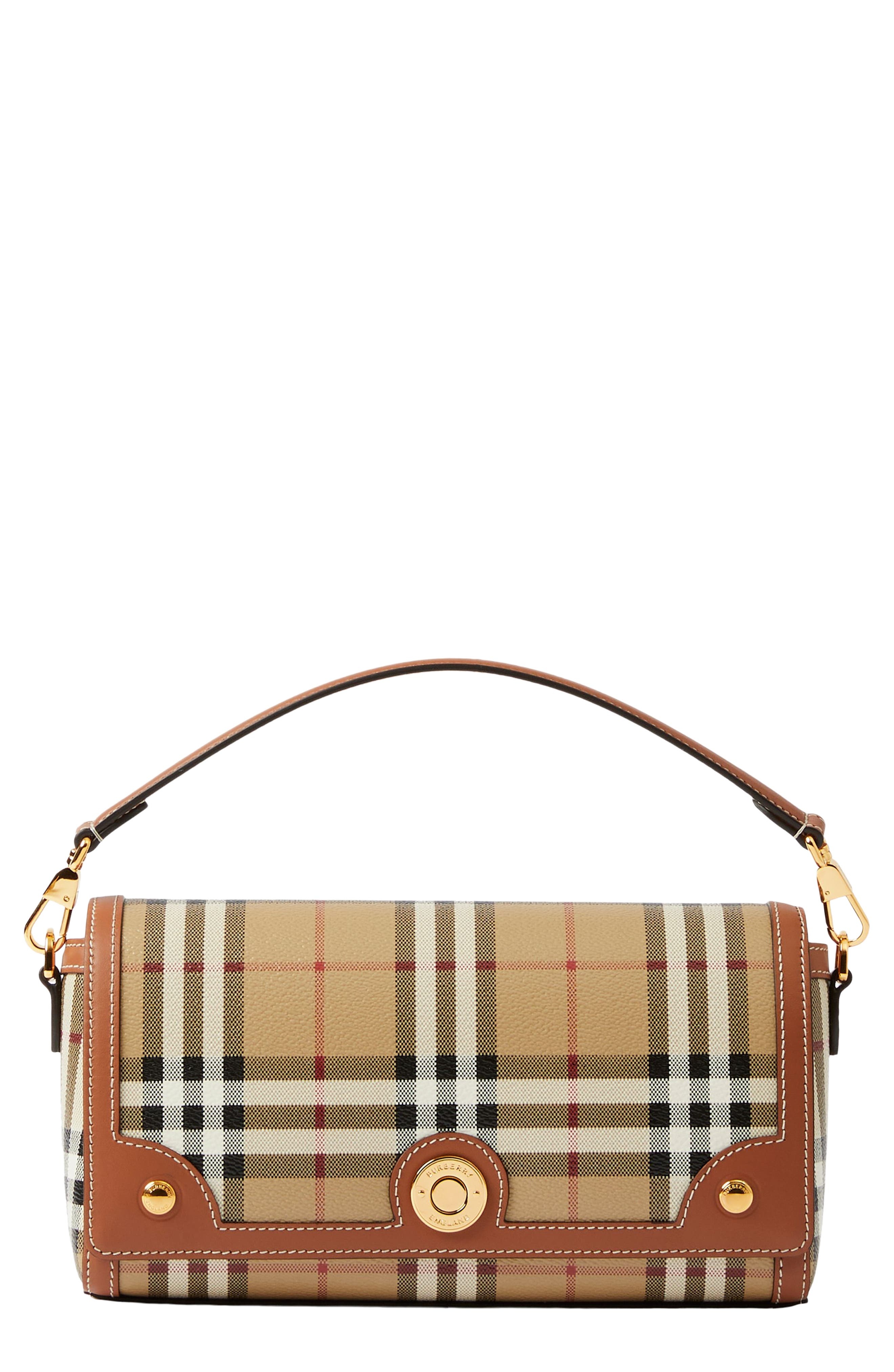 Burberry check patterns this coated-canvas bag trimmed in topstitched leather, accented with gleaming hardware and convertible from crossbody to clutch. Magnetic-snap flap closure Removable top carry handle; removable, adjustable crossbody strap Interior card slot Textile with leather trim Made in Italy Designer Handbags
