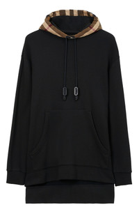 A checked hood brings Burberry's signature style to a cotton hoodie finished with logo-embossed leather accents at the drawstrings. 27 1/2" length (size Medium) Drawstring hood Ribbed cuffs and hem Kangaroo pocket 100% cotton Machine wash, dry flat Made in Portugal Designer Clothing