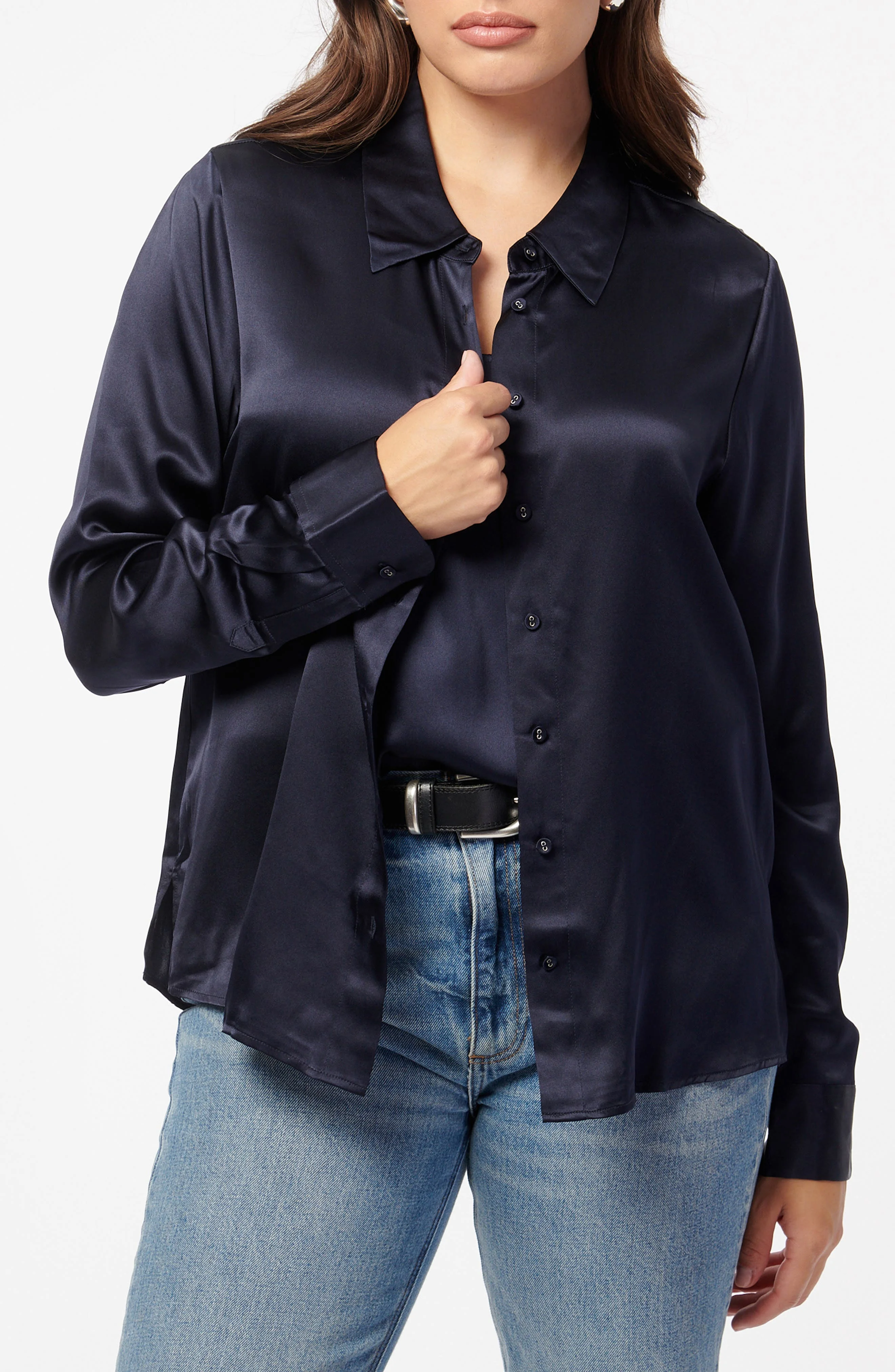 Lustrous silk charmeuse elevates a luxe button-up shirt cut in a relaxed fit that's perfect for wearing solo or layering up. 25 1/2" length Front button closure Point collar Long sleeves with button cuffs 100% silk Dry clean Imported