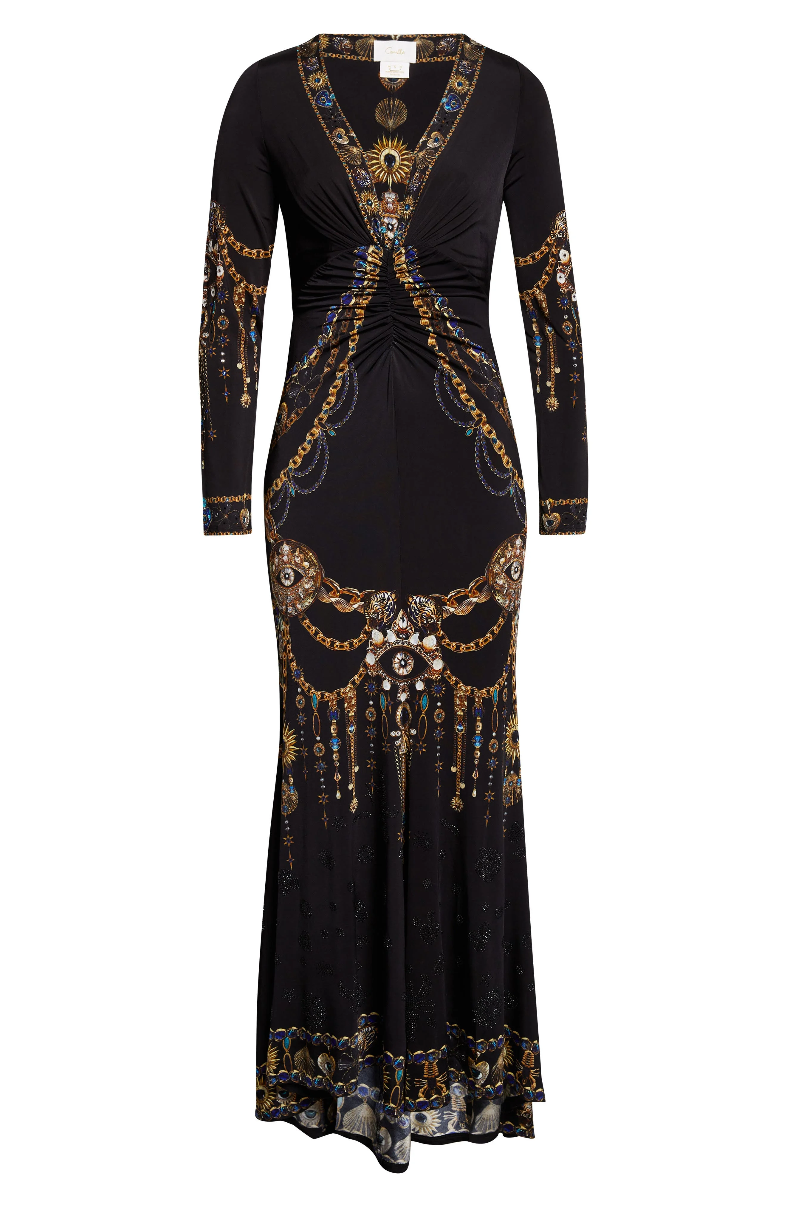 Camilla's signature crystals shimmer like scattered constellations across this artfully gathered jersey dress in a limited-edition print of charms, chains and talismans inspired by the rich tradition of Turkish jewelry and the art of adornment. Hidden side-zip closure Plunge neck Long sleeves 92% viscose, 8% elastane Dry clean Imported Designer Clothing