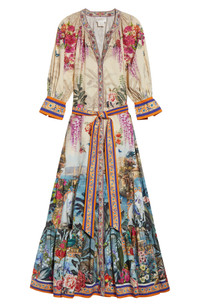 An imaginative placed print featuring jungle animals, sailboats and botanicals brings bold color to this tiered maxi dress bordered with sparkling crystal embellishment along the placket. Front button closure Split neck Three-quarter sleeves with flared one-button cuffs Removable sash 100% organic cotton Dry clean Imported Designer Clothing