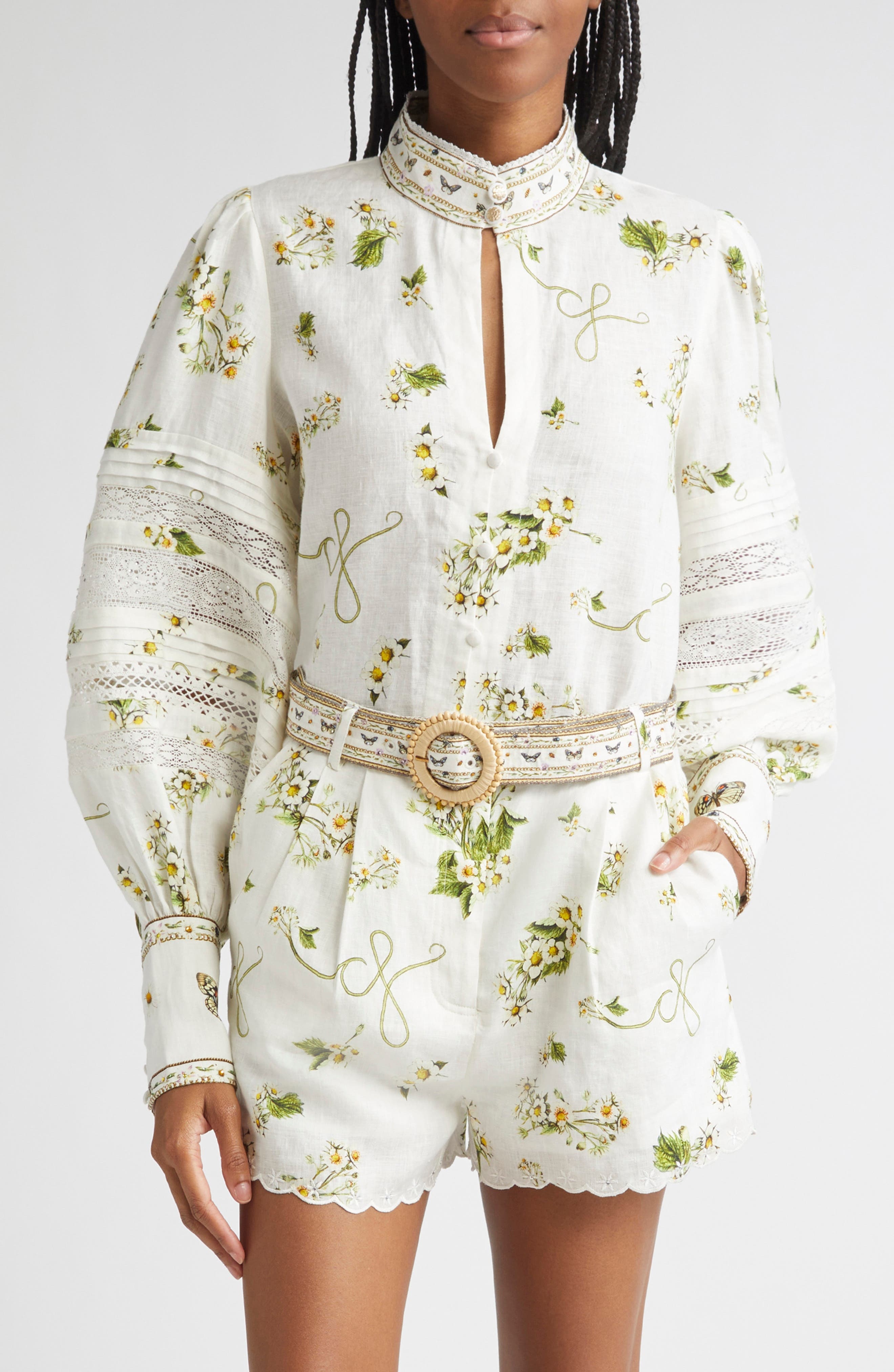 Cruise into warm weather in this hand-sewn linen shirt with a print that captures the unbridled beauty of wildflower fields. Exquisite lace insets and Camilla's signature crystals complete the romantic look. Front keyhole with button-and-loop closure Mock neck Long sleeves with rouleau-button cuffs 100% linen Dry clean Imported Designer Clothing