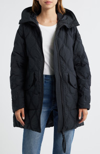 Conquer your next adventure wearing this matte-finish quilted jacket made in a longline silhouette and fitted with a protective snorkel hood. Two-way front-zip closure Fixed snorkel hood Interior backpack straps for hands-free carrying capabilities Front snap flap pockets; side-seam zip pockets Lined 57% cotton, 43% recycled nylon Machine wash, tumble dry Made in Canada