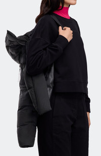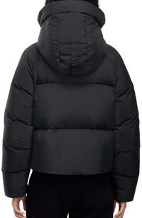 Brave the cold in a 750-fill-power down bomber that's topped with a lock-in heat placket and an adjustable hood for extra cold-shielding capability. A shorter silhouette with a relaxed fit allows this jacket to easily move with your body for even more comfort. Front two-way zip closure with snap storm placket Adjustable down-filled hood Recessed rib-knit cuffs Exterior fleece-lined zip pockets; zip pocket on sleeve Interior drop-in pocket Interior backpack straps for hands-free carrying capabilities Lined, with 750 fill-power down (90% down, 10% feather fill) 100% recycled nylon Machine wash, tumble dry Made in Canada
