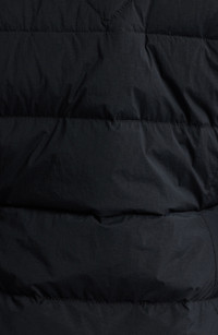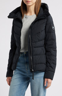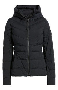Chic chevron quilting on the bodice shapes the fit-and-flare silhouette of this chill-ready puffer jacket equipped with hand-warmer pockets and a sueded chin guard for convenient comfort. Two-way front-zip closure Fixed hood Front zip pockets Power stretch cuffs Interior shoulder straps for hands-free carry Lined, with 90% down, 10% feather fill 87% recycled nylon, 13% spandex Machine wash, tumble dry Made in Canada