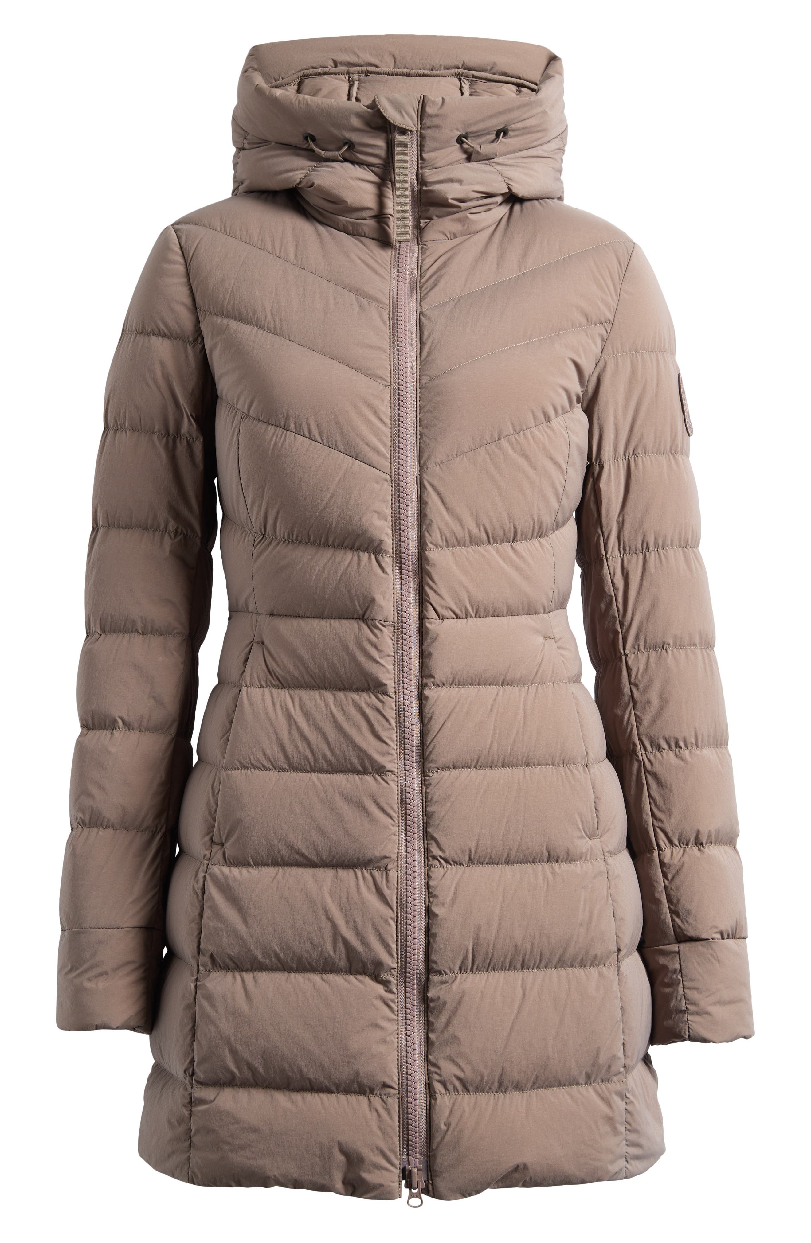 Stretch-enhanced recycled-nylon Aira fabric combined with tailored seaming keeps the silhouette shapely and fitted for this puffer coat topped with a snorkel-style hood and made to withstand some of the worst weather and colder temperatures without sacrificing an ounce of style. Two-way front-zip closure with chin guard Stand collar; drawcord-toggle hood Inset ribbed cuffs On-seam zip pockets; interior zip pocket Interior shoulder straps for hands-free carry Versatile: Canada Goose Thermal Experience Index™ 2 is designed for core warmth and versatility and is temperature rated to 5°F/-15°C Durable water-repellent (DWR) finish Water repellent; wind resistant; downproof Lined, with 750-fill-power 90% down, 10% feather fill 87% recycled nylon, 13% spandex Machine wash, tumble dry Made in Canada