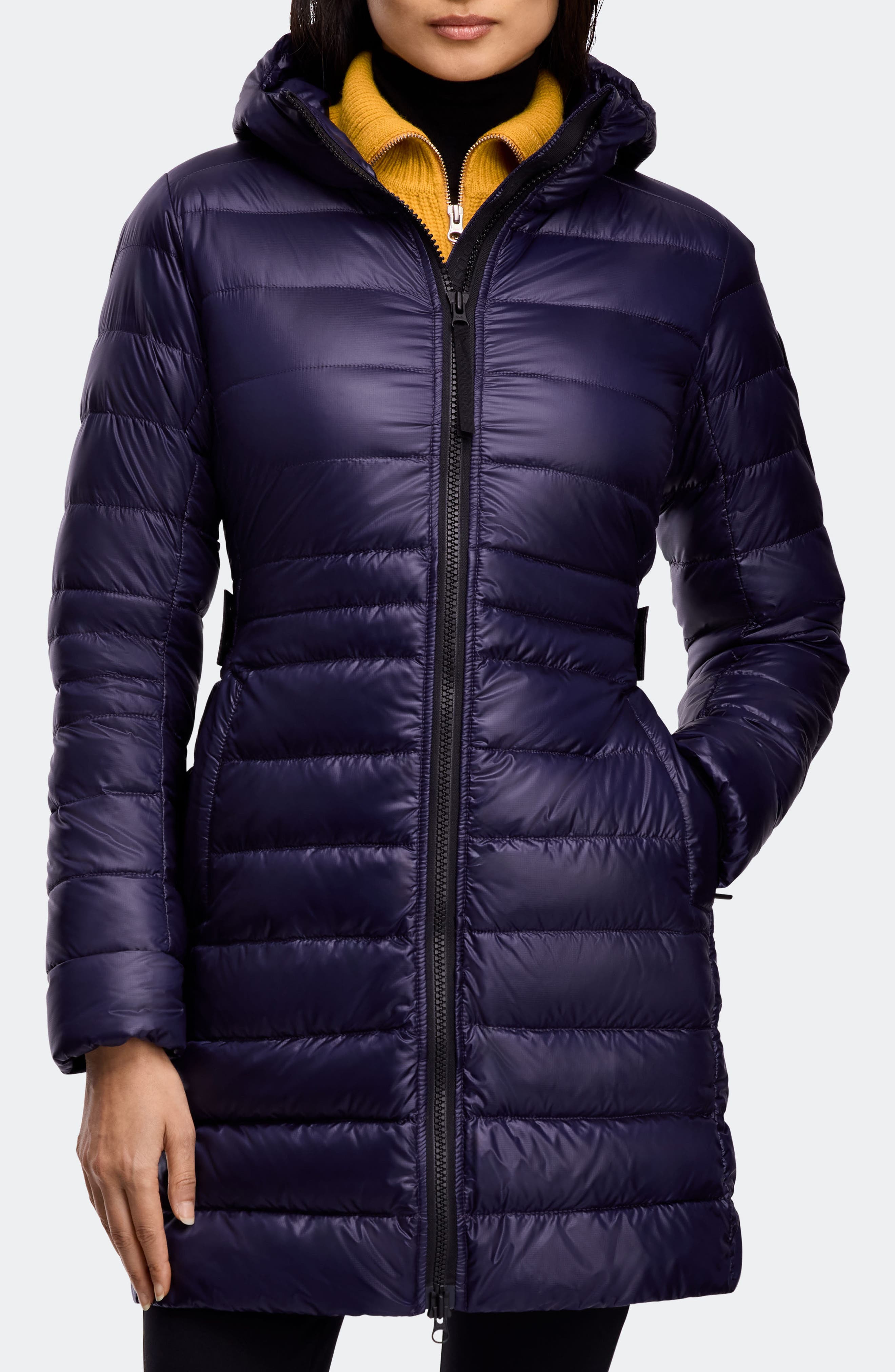 This ultralight puffer jacket offers warmth and protection from the elements with its plush fill and recessed Power Stretch® cuffs to lock in heat. 34" length (size Medium) Two-way front-zip closure Adjustable hood Recessed Power Stretch® cuffs Front zip welt pockets; interior pocket Side snap vents Reflective details enhance visibility in low light or at night Water-resistant Lightweight: Canada Goose Thermal Experience Index™ 1 is designed for active pursuits and is temperature rated to 23°F/-5°C Lined, with 750-power-fill down 100% recycled nylon Machine wash, tumble dry Made in Canada