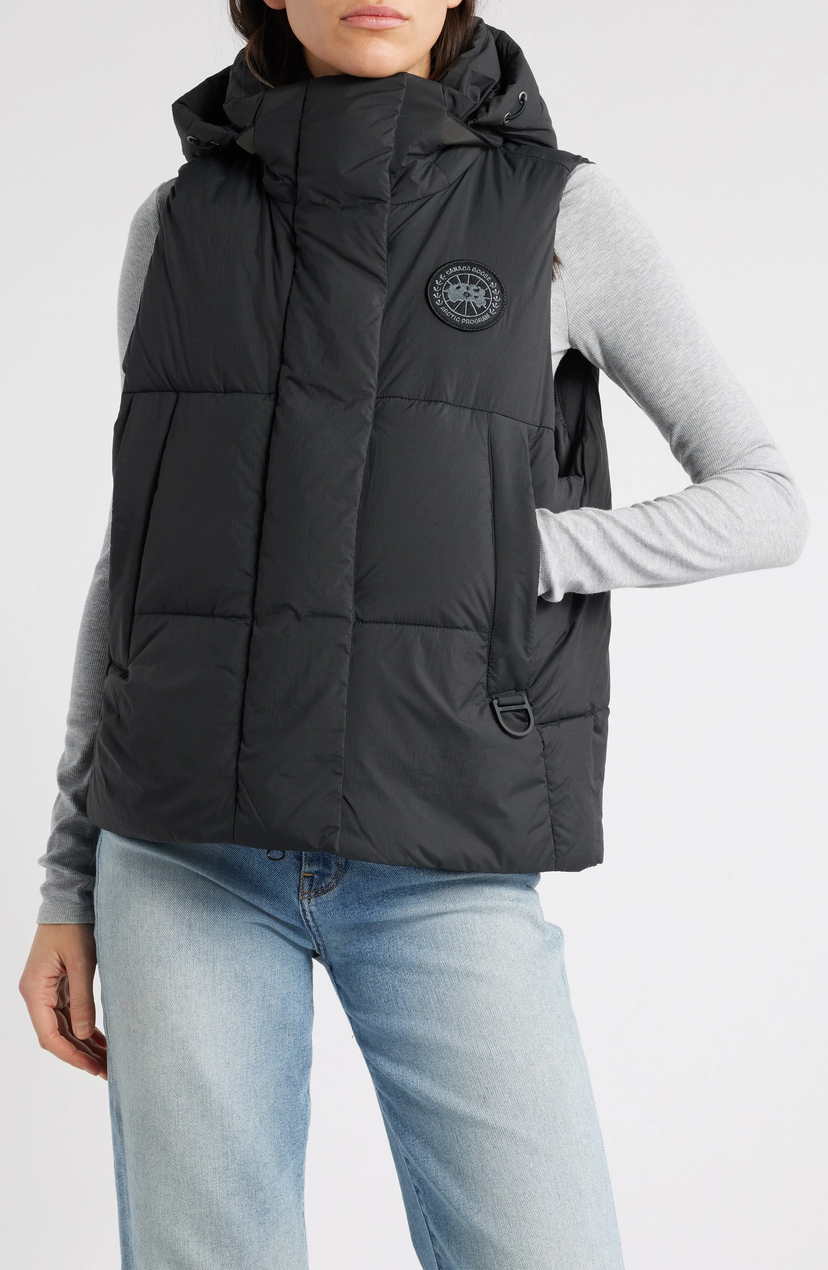 Conquer cold-weather days with this expertly crafted puffer vest, insulated with 750-fill-power down for exceptional warmth. Designed with a removable hood and thoughtful utility details, it’s the perfect blend of functionality and comfort for wintry adventures. Two-way front-zip closure with snap storm placket Stand collar; removable drawcord hood Front zip hand-warmer pockets; zip security pocket underneath placket; two interior mesh drop-in pockets Cordura®-reinforced high-abrasion areas Lightweight: Canada Goose Thermal Experience Index™ 1 is designed for active pursuits and is temperature rated to 23°F/-5°C Lined, with 90% down, 10% feather 750-fill-power fill (Canada) 100% recycled nylon Machine wash, tumble dry Made in Canada