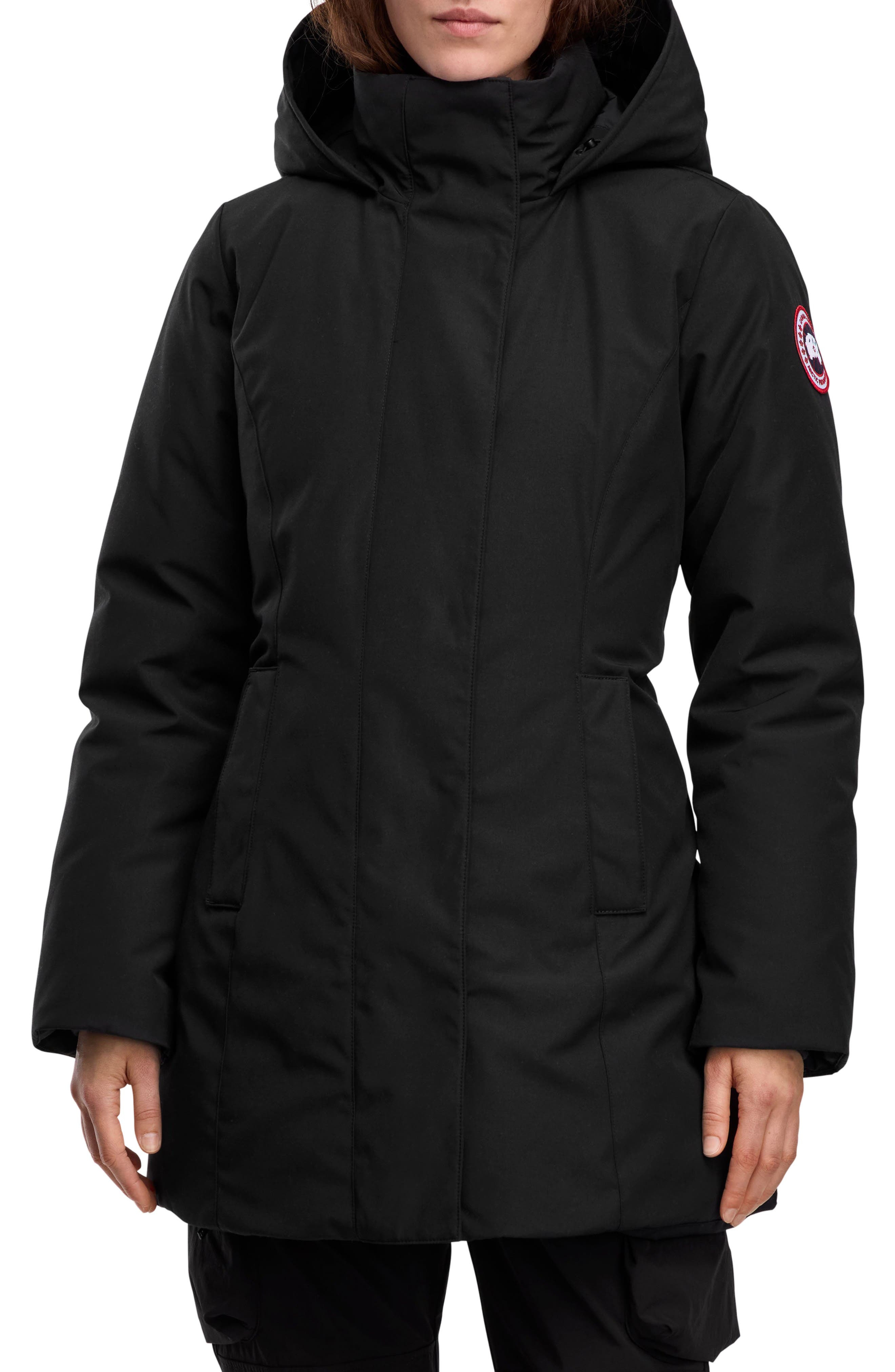 Inspired by the brand's 2010 Victoria parka, the Leslie offers extreme weather protection for all winter adventurers with a more modern look and feel. A rugged water-resistant shell made from a blend of recycled and organic fibers stands the test of time, while superior 625-fill-power down blend offers incomparable warmth when temperatures plummet. Two-way front-zip closure with snap storm placket Stand collar; fixed, drawcord-toggle hood Inset ribbed cuffs On-seam snap pockets; interior zip and drop-in pockets Interior shoulder straps for hands-free carry Fundamental: Canada Goose Thermal Experience Index™ 3 is designed for fundamental warmth and everyday use and is temperature rated to -4°F/-20°C Durable water-repellent (DWR) finish Lined, with 625-fill-pwer 80% down, 20% feather fill 83–85% recycled polyester, 15–17% organic cotton Dry clean Made in Canada