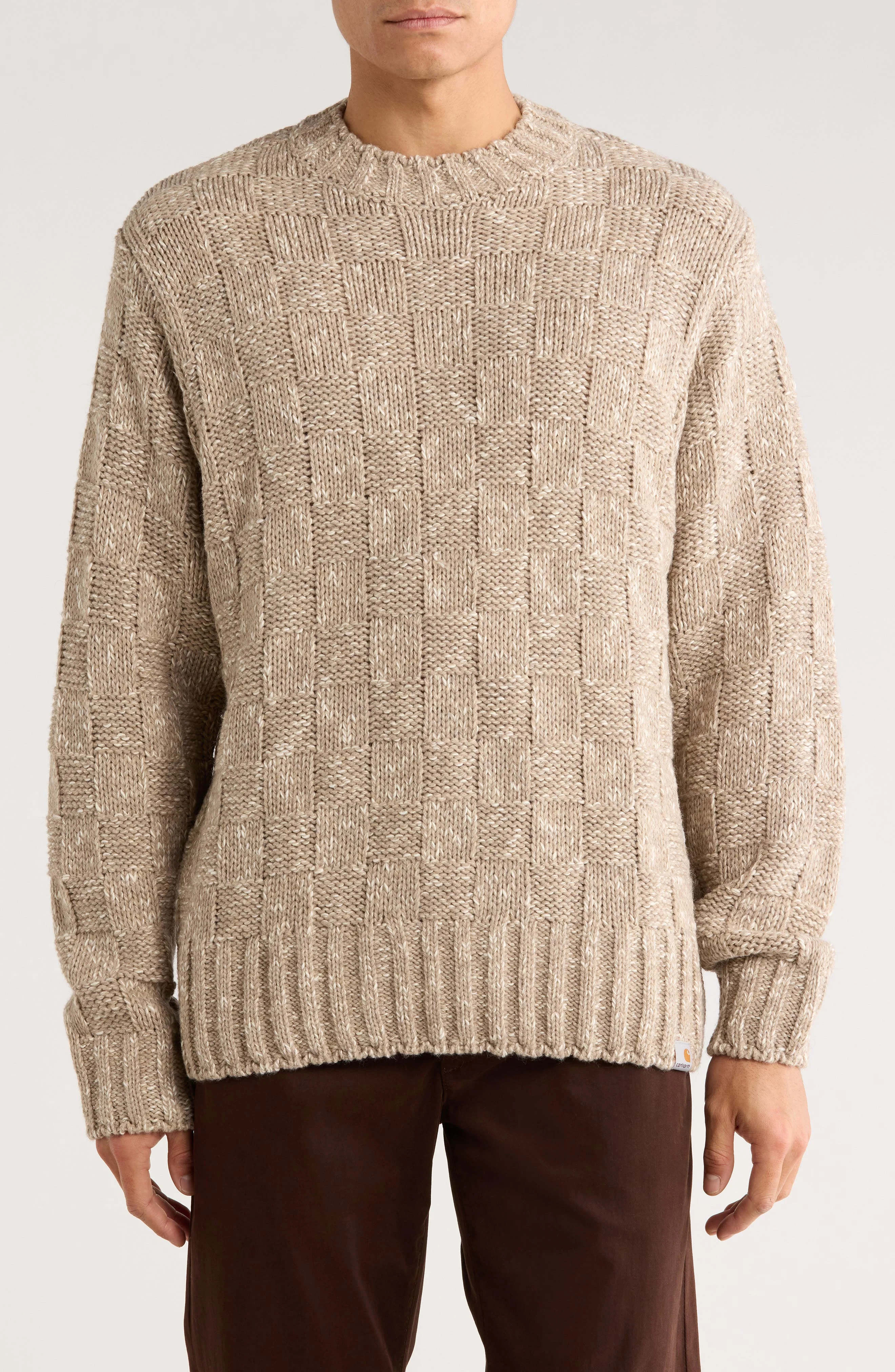 Marled yarn knit into a check pattern adds warm texture to this handsome sweater that's ideal for relaxed office days and causal outings. Crewneck Long sleeves 55% acrylic, 33% cotton, 6% wool, 3% viscose, 3% alpaca Dry clean Imported