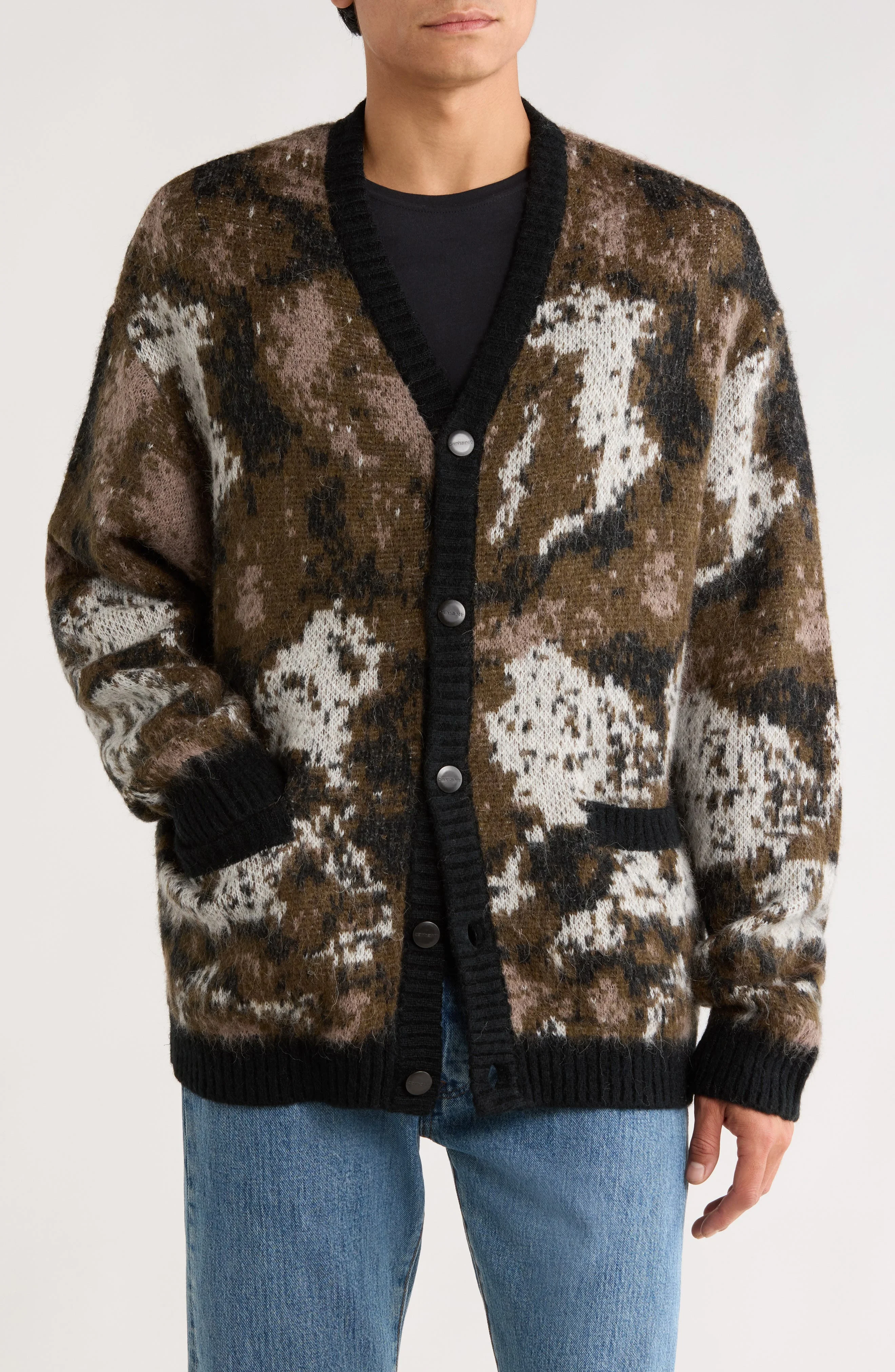 Carhartt’s workwear DNA is reimagined in this V-neck cardigan jacquard-knit with a camo-like motif from an alpaca-enriched blend that brings dimensional texture and generous drape. Roomy dropped shoulders frame the body with ease and rib cuffs, hem and placket keep edges tidy. Front button closure V-neck Long sleeves Drop-in pockets Dropped shoulders Ribbed cuffs and hem 40% acyclic, 30% alpaca, 30% nylon Dry clean Imported