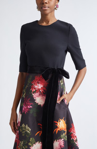 Carolina Herrera Chrysanthemum Print Crepe, Velvet & Faille Fit & Flare Midi Dress in Black Multi at