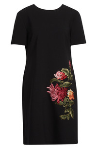 Large-scale floral embroidery brings the label's decadent drama to a fitted shift dress fashioned from stretch-softened virgin wool. Scoop neck Short sleeves 97% virgin wool, 3% elastane Dry clean Imported Designer Clothing Hispanic & Latinx Owned/Founded