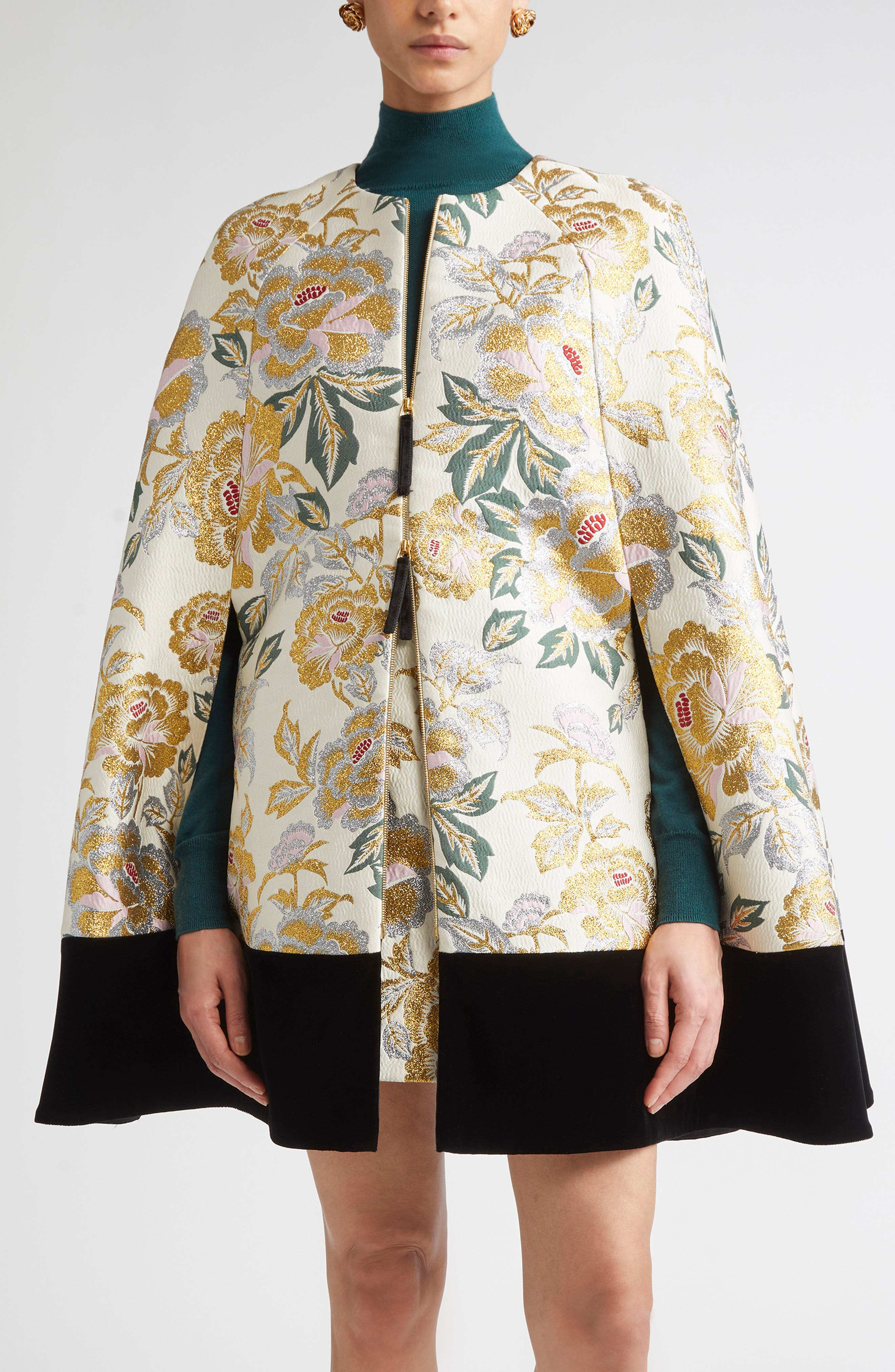Luxurious metallic jacquard in a vintage-inspired floral motif brings retro charm to this opulent runway-featured cape trimmed with plush velvet. Two-way front-zip closure Crewneck 77% polyester, 12% metallic fibers, 11% polyamide Dry clean Made the USA Designer Clothing Hispanic & Latinx Owned/Founded