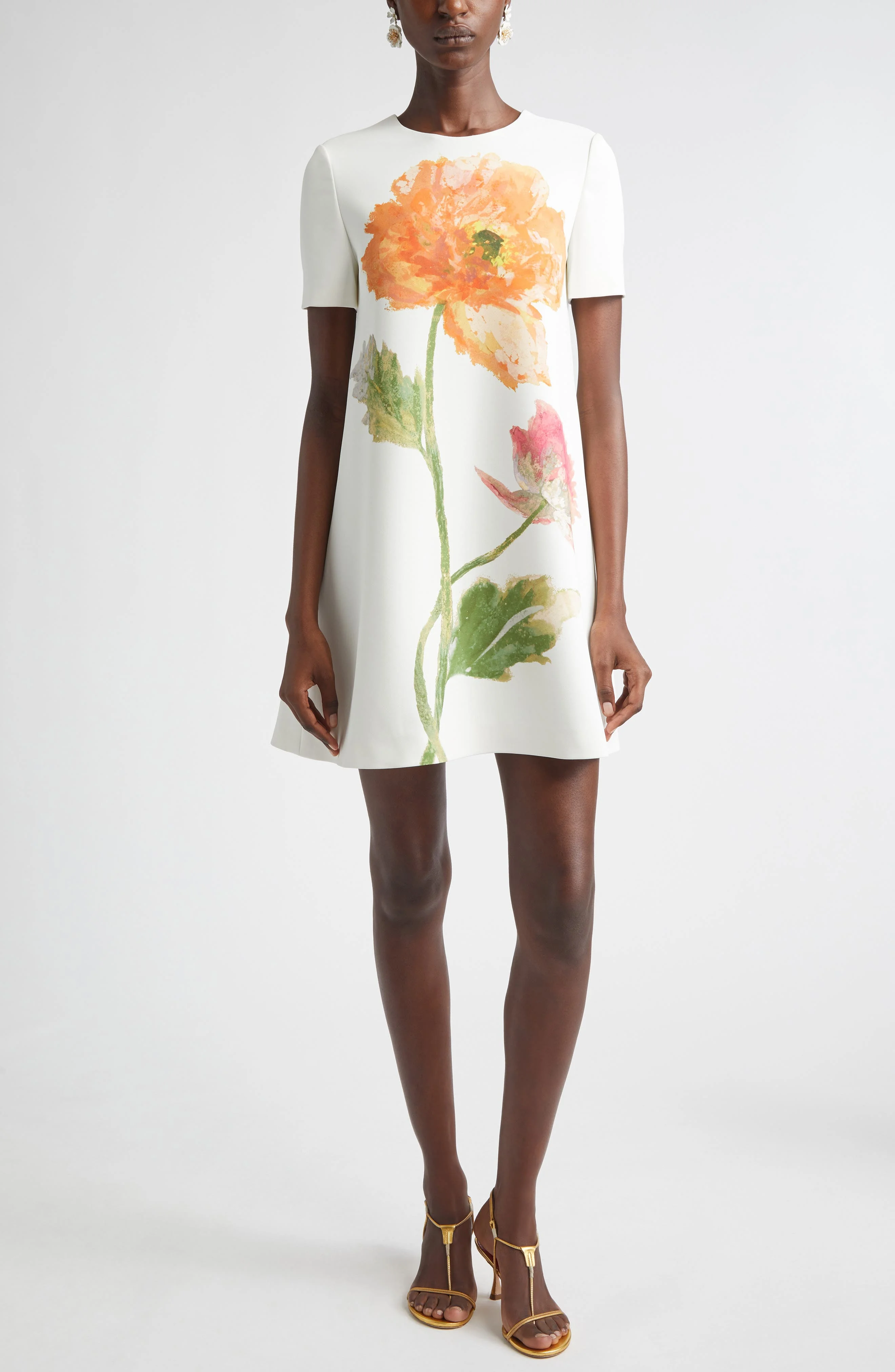 Carolina Herrera Poppy Print Stretch Crepe A-Line Minidress in White Multi at Nordstrom